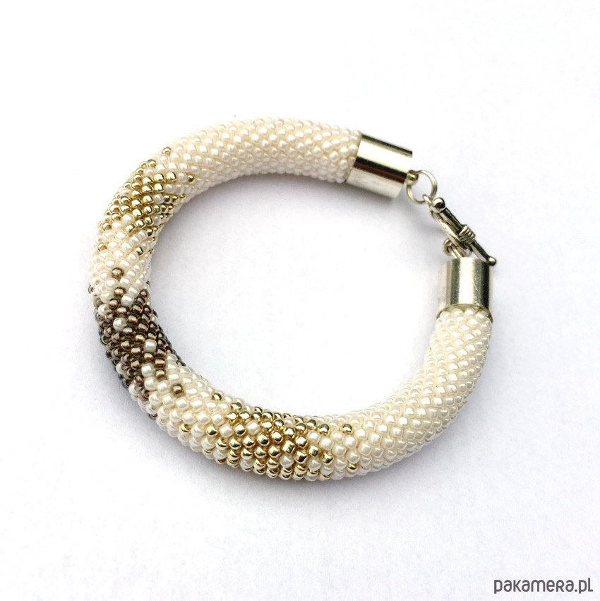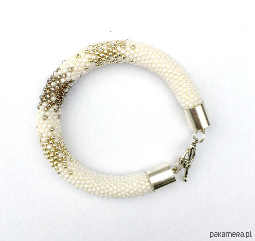 Cieniowana biała bransoletka z domieszką odcieni szarości i srebra - upleciona ręcznie z ponad tysiąca japońskich szklanych koralików. Wykończona elementami z metalu w kolorze srebra.