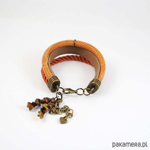 Bransoletka zrobiona jest z rzemieni ze skóry ekologicznej oraz sznurka.