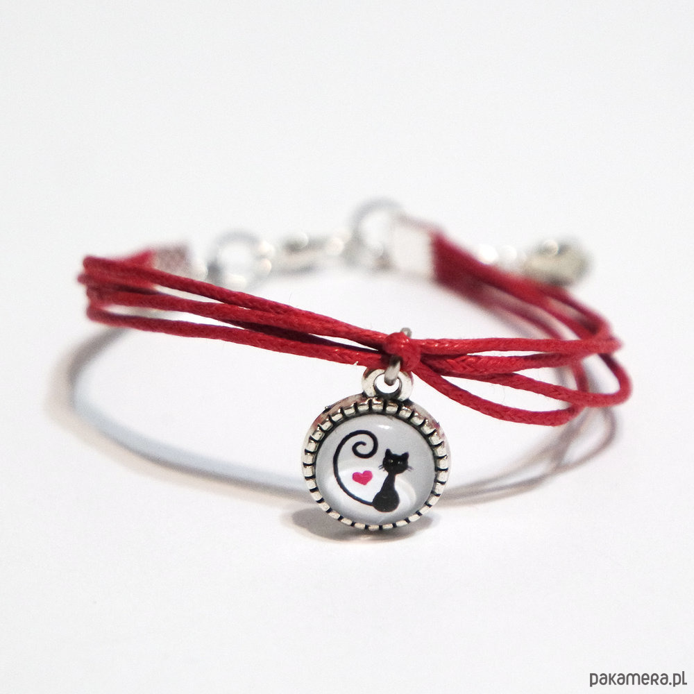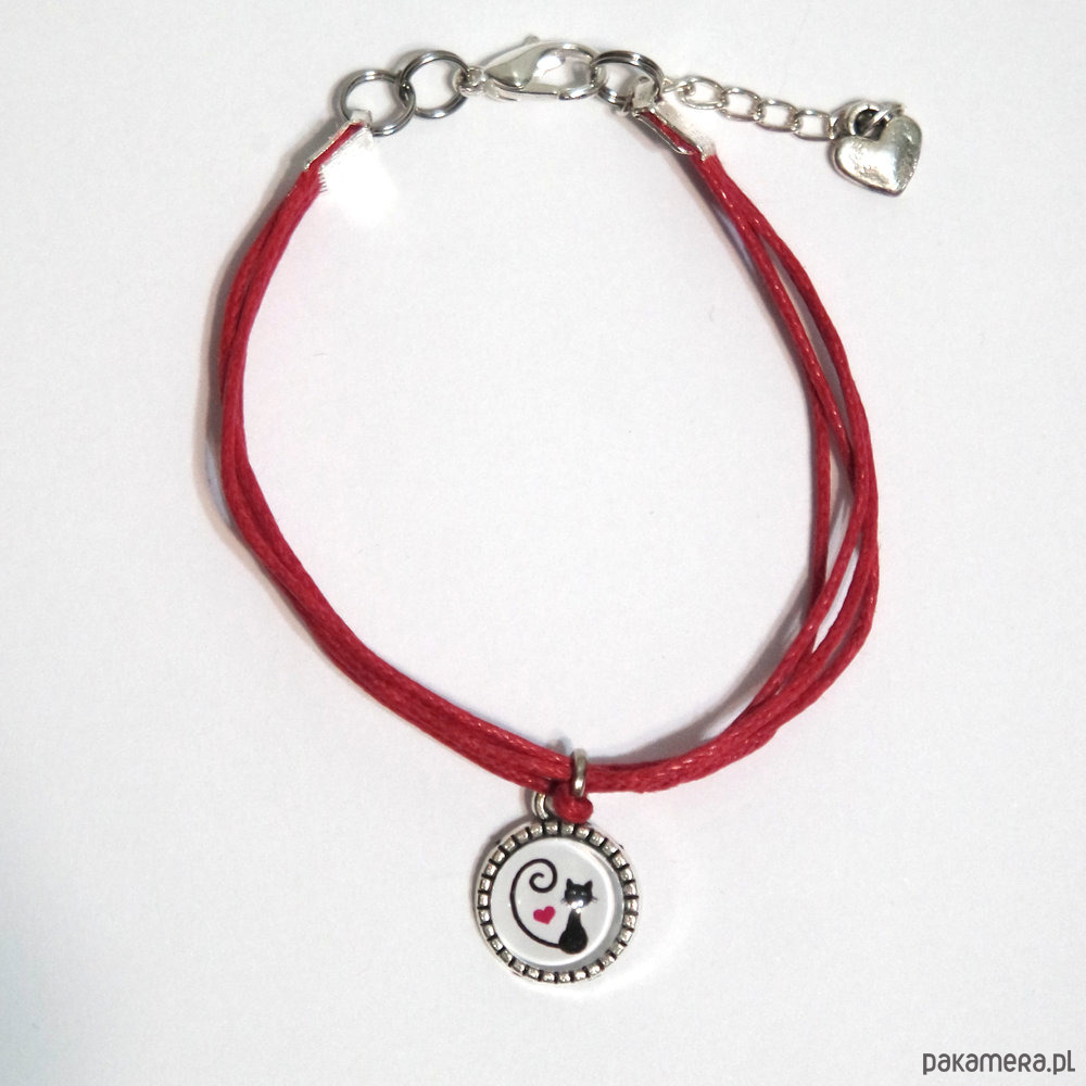 Bransoletka - Kotek, serce - sznureczki, czerwona