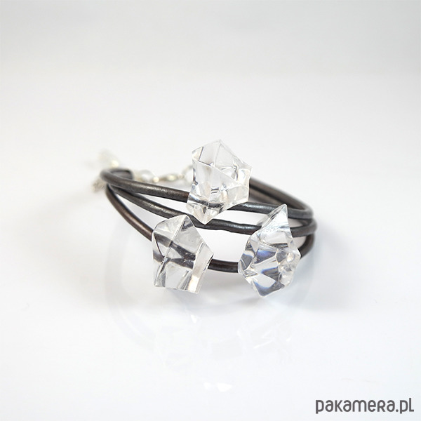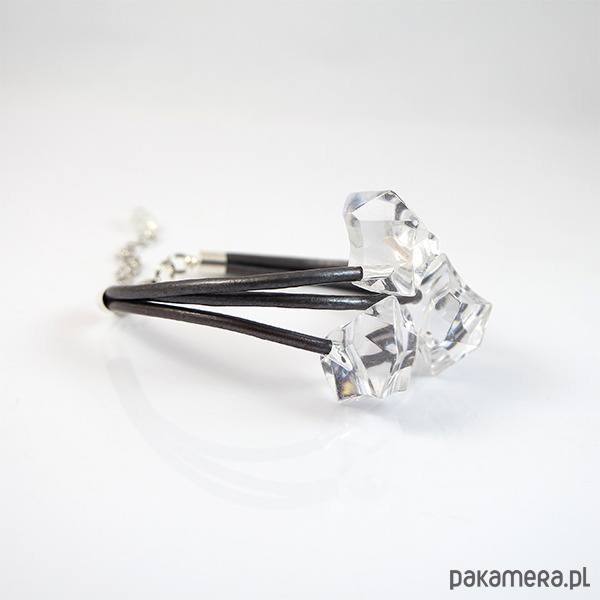 Bransoletka zrobiona jest z rzemieni ze skóry naturalnej oraz akrylowych przekładek w kształcie kawałków lodu, kryształków.