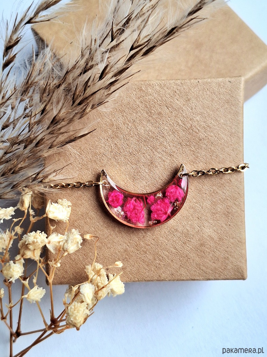 Urocza bransoletka z zatopionymi kwiatami gipsówki w kolorze fuksji i drobinkami złota. Wykonana z wysokiej klasy żywicy, która nie zmienia koloru pod wpływem promieniowania uv oraz wysokiej jakości stali chirurgicznej.