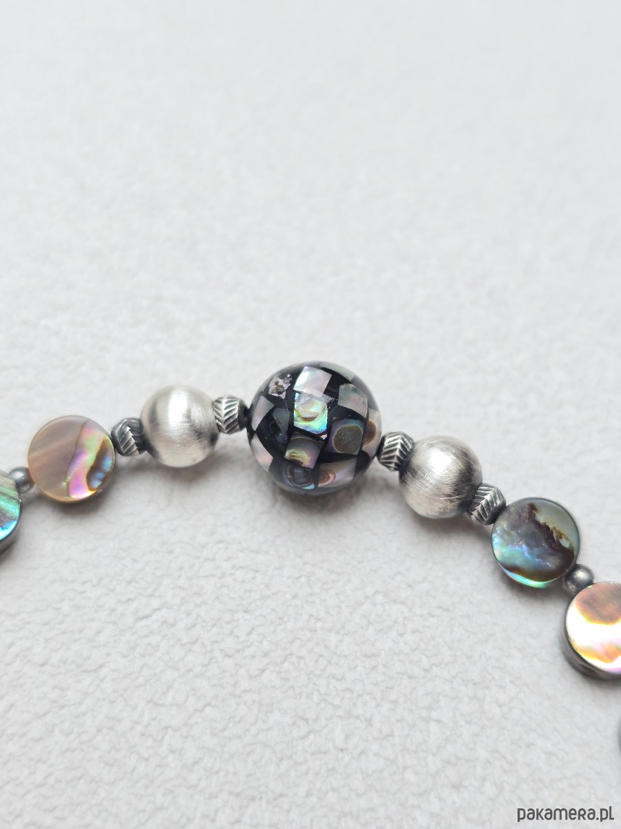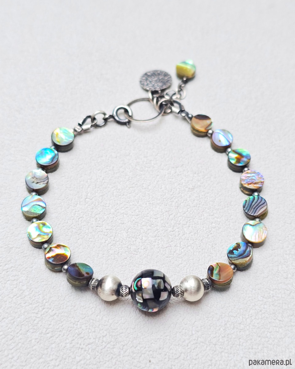 Cudownie mieniąca się, piękna bransoletka z muszli abalone (paua).