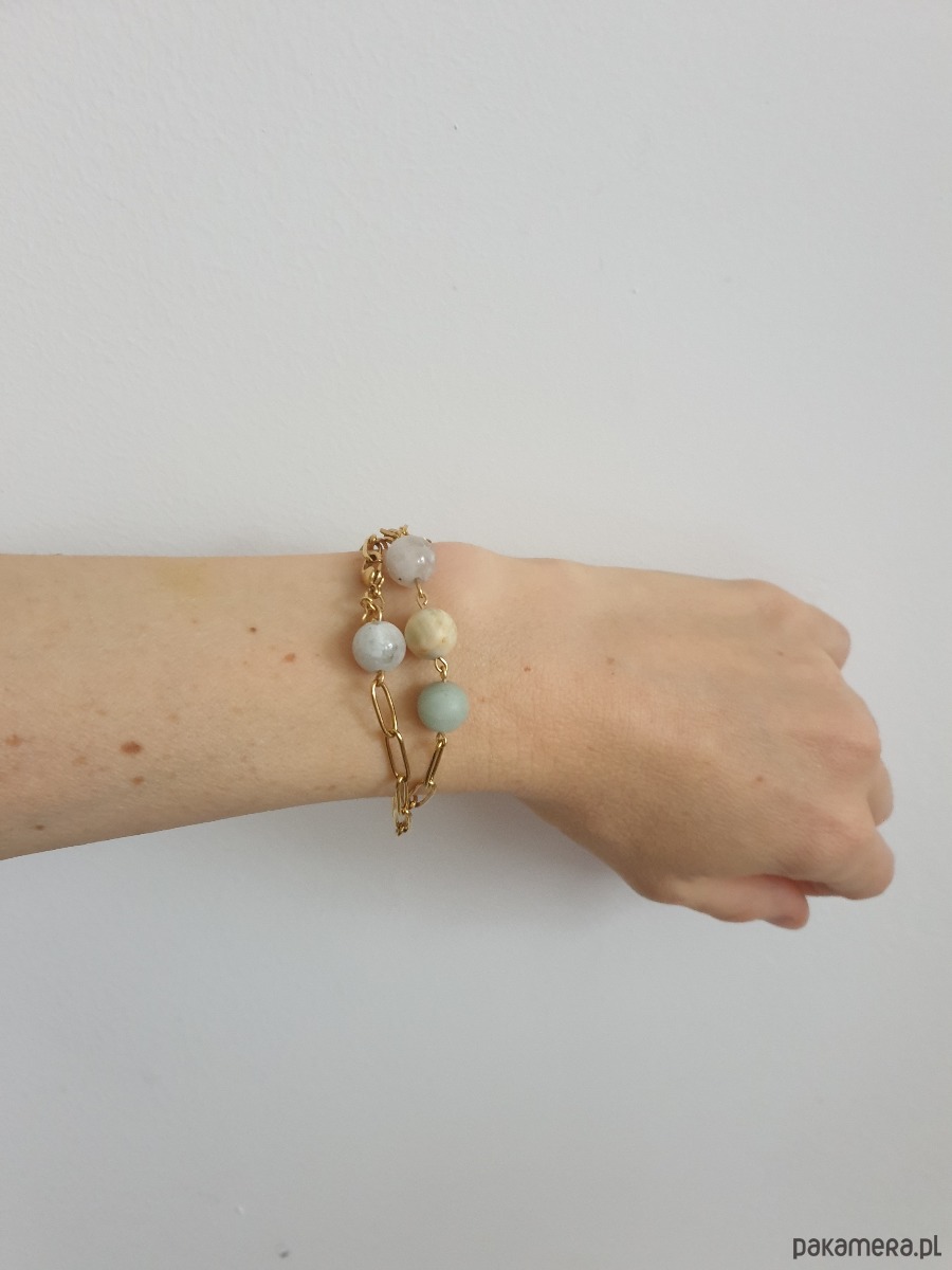 Minimalistyczna delikatna bransoletka KULKI 3. Tworzona ręcznie z kamieni naturalnych, łańcucha i elementów ze stali szlachetnej pozłacanej (antyalergicznej) W tej - matowa kulka kamień księżycowy, amazonit, akwamaryn.
