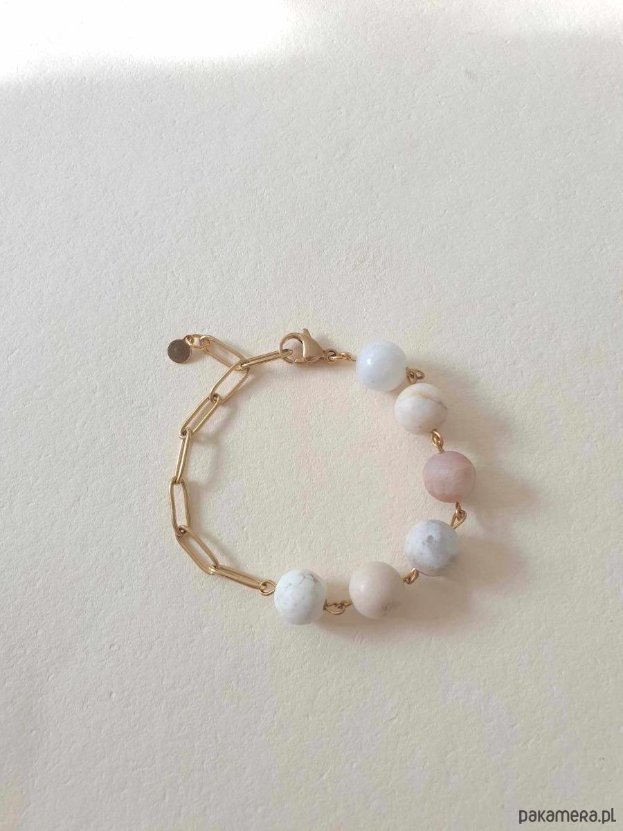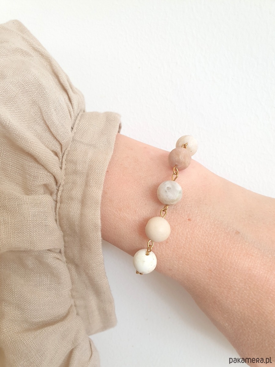 Minimalistyczna delikatna bransoletka KULKI 6. Tworzona ręcznie z kamieni naturalnych, łańcucha i elementów ze stali szlachetnej pozłacanej (antyalergicznej) W tej - kamyczki specjalnie dobrane w kremowych barwach różne kamienie: howlit kremowy, kamień rzeczny, agat drzewny, kamień słoneczny, amazonit, kamień księżycowy. Bransoletka tworzona na zamówienie, z tych samych kamieni ale mogą się minimalnie różnić ze względu na to że każdy kamień jest wyjątkowy
