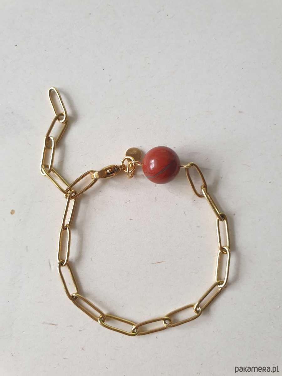 Minimalistyczna delikatna bransoletka KULKI. Tworzona ręcznie z kamieni naturalnych, łańcucha i elementów ze stali szlachetnej pozłacanej (antyalergicznej) W tej - kulka jaspis czerwony