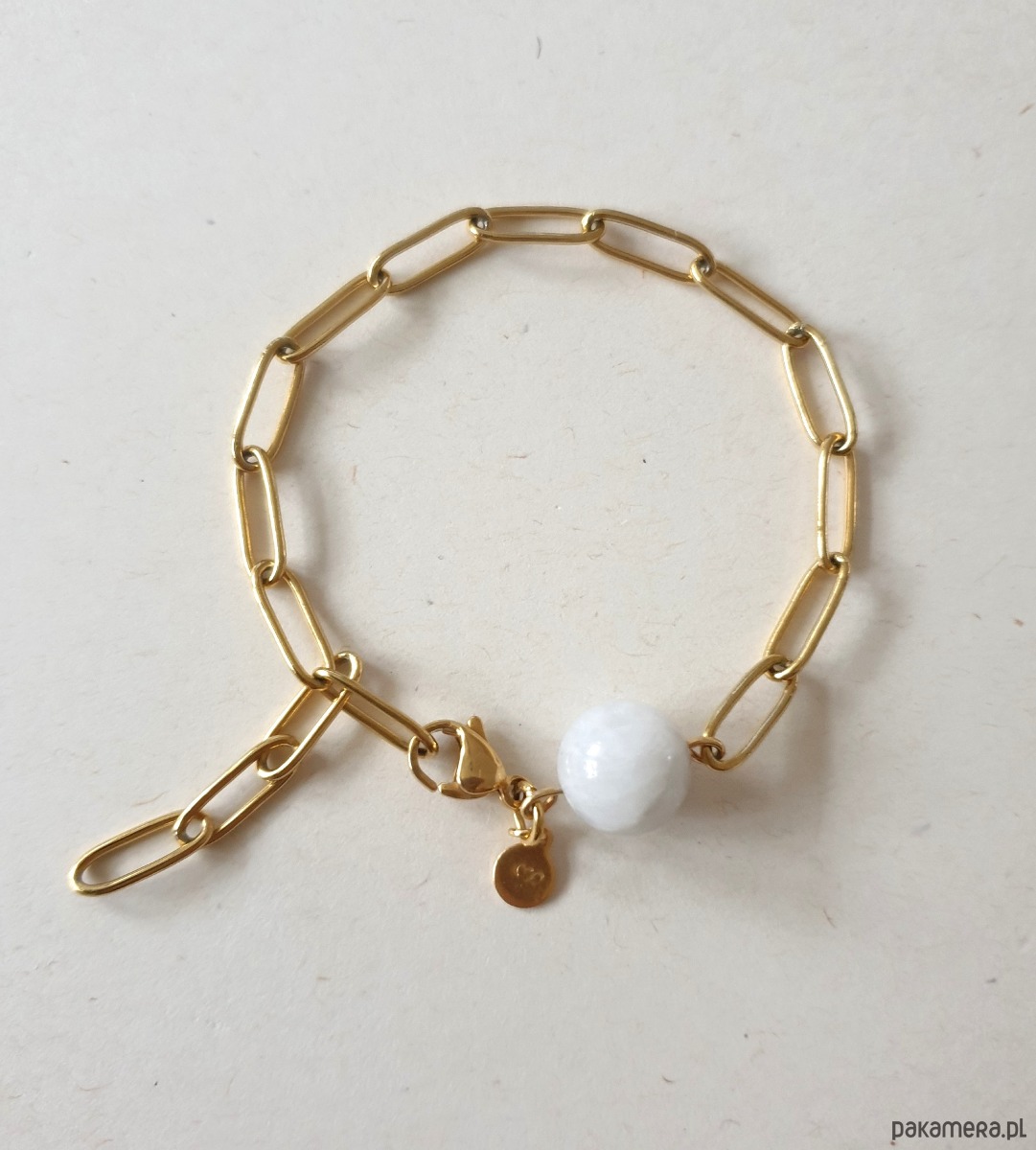 Długość całej bransoletki 19 cm, można zapinać na którekolwiek oczko by dopasować do odpowiedniej długości. Oczka łańcuszka wielkość ok. 1,2 cm /0,4 cm, średnica kulki ok 1 cm.