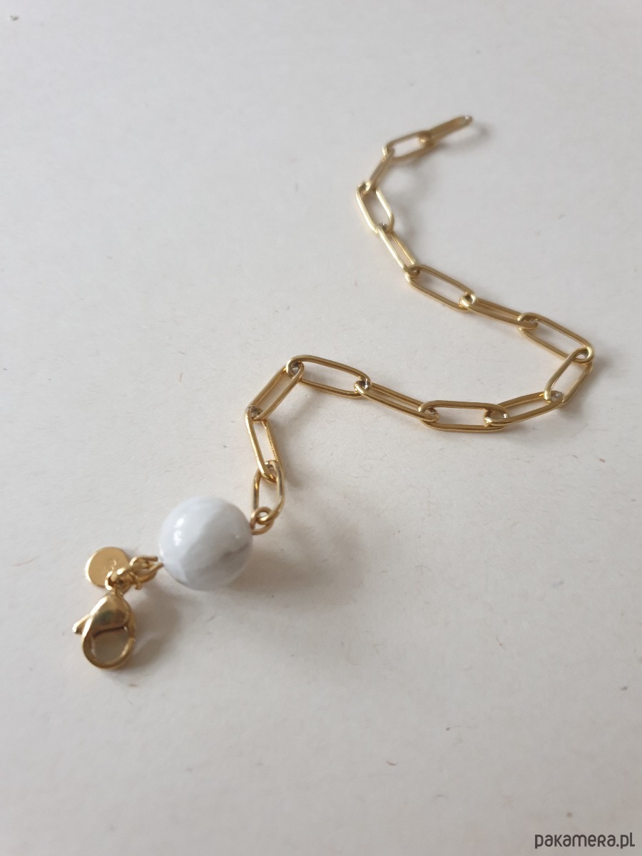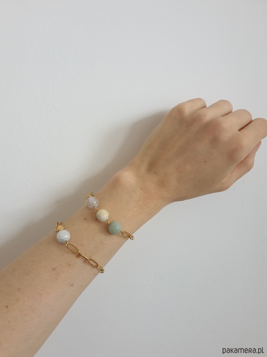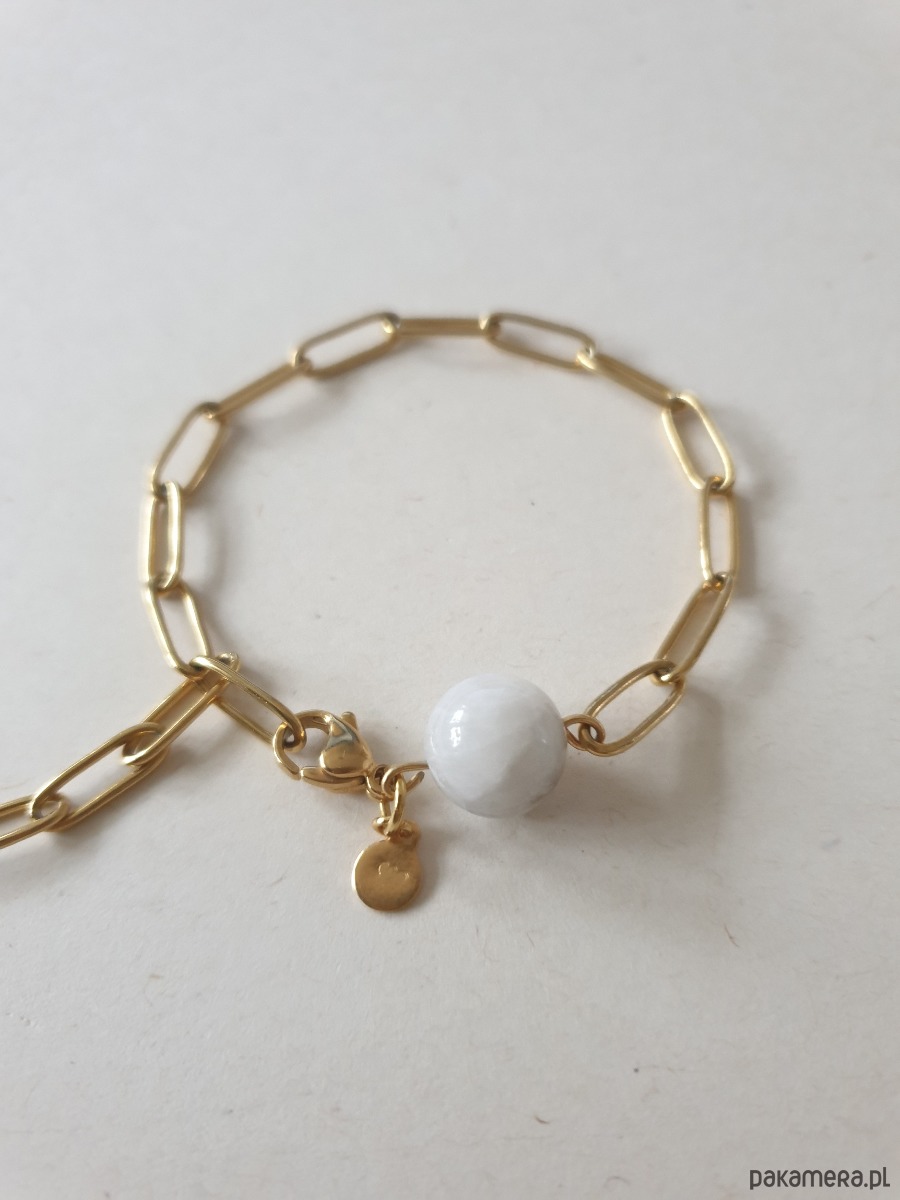 Minimalistyczna delikatna bransoletka KULKI. Tworzona ręcznie z kamieni naturalnych, łańcucha i elementów ze stali szlachetnej pozłacanej (antyalergicznej) W tej - matowa kulka kamień księżycowy.
