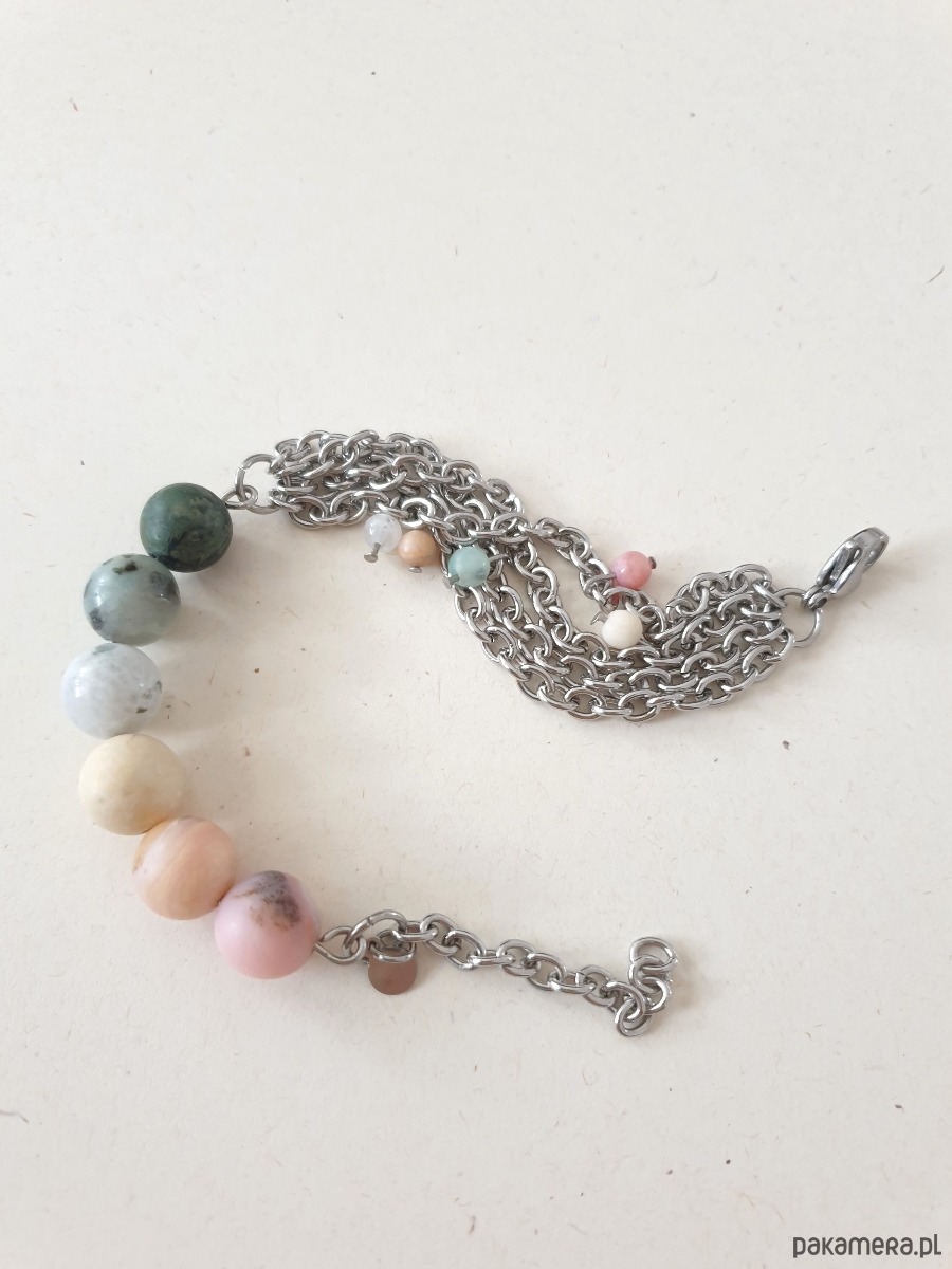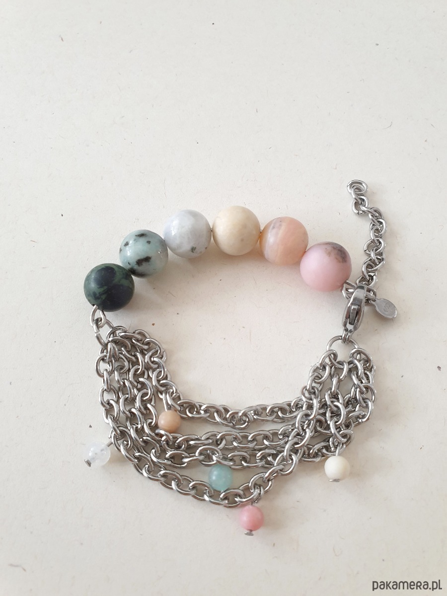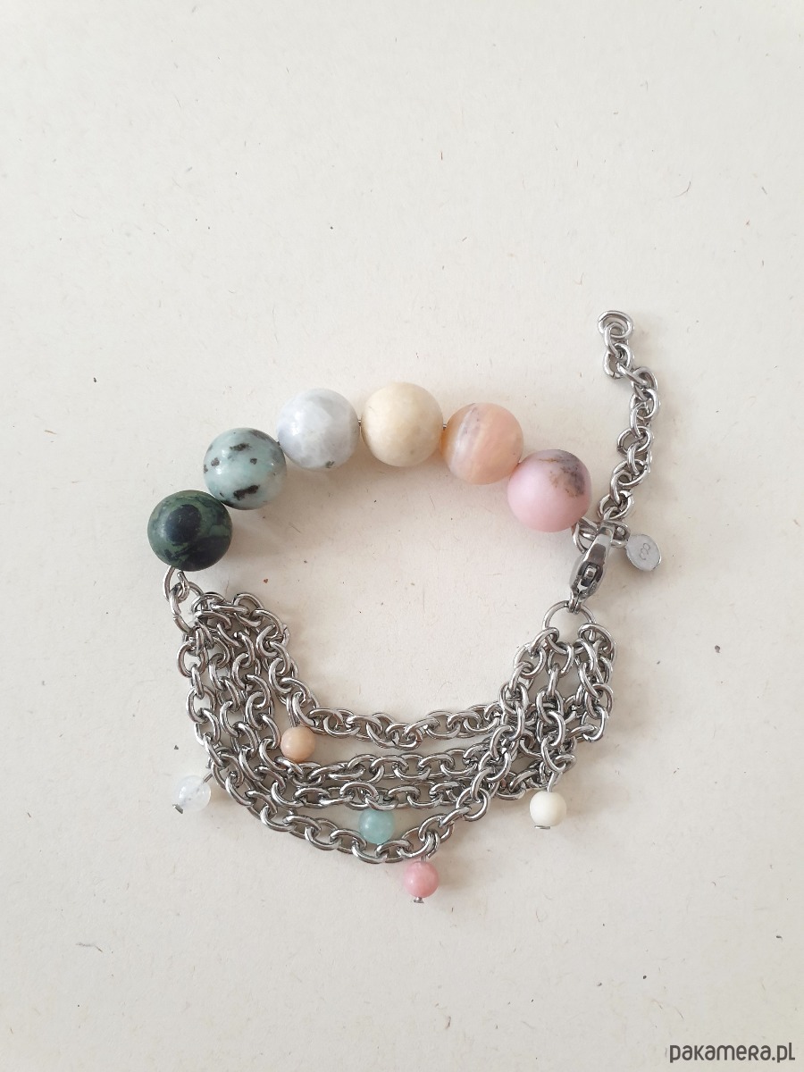 Duża bransoletka KULKI z łańcuszkami. Tworzona ręcznie z kamieni naturalnych, łańcucha i elementów ze stali szlachetnej (antyalergicznej) W tej - matowa kulka jaspis kambaba, jaspis lotus, kamień księżycowy, kamień rzeczny, kamień słoneczny, opal indyjski różowy
