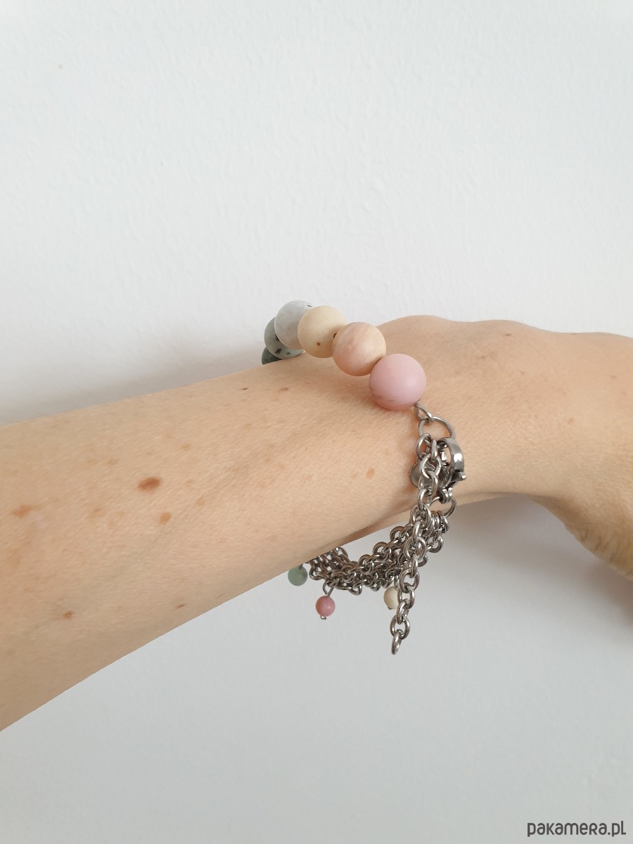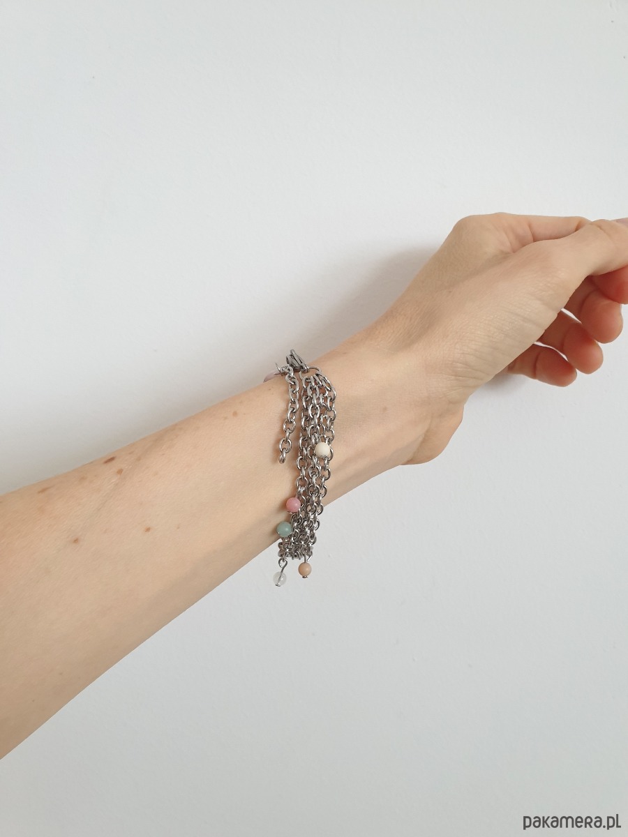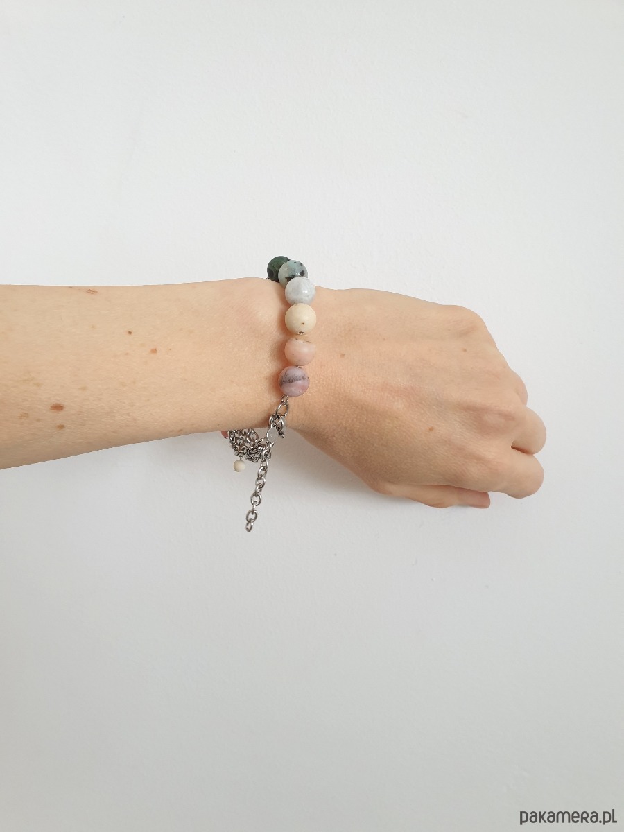 Duża bransoletka KULKI z łańcuszkami. Tworzona ręcznie z kamieni naturalnych, łańcucha i elementów ze stali szlachetnej (antyalergicznej) W tej - matowa kulka jaspis kambaba, jaspis lotus, kamień księżycowy, kamień rzeczny, kamień słoneczny, opal indyjski różowy