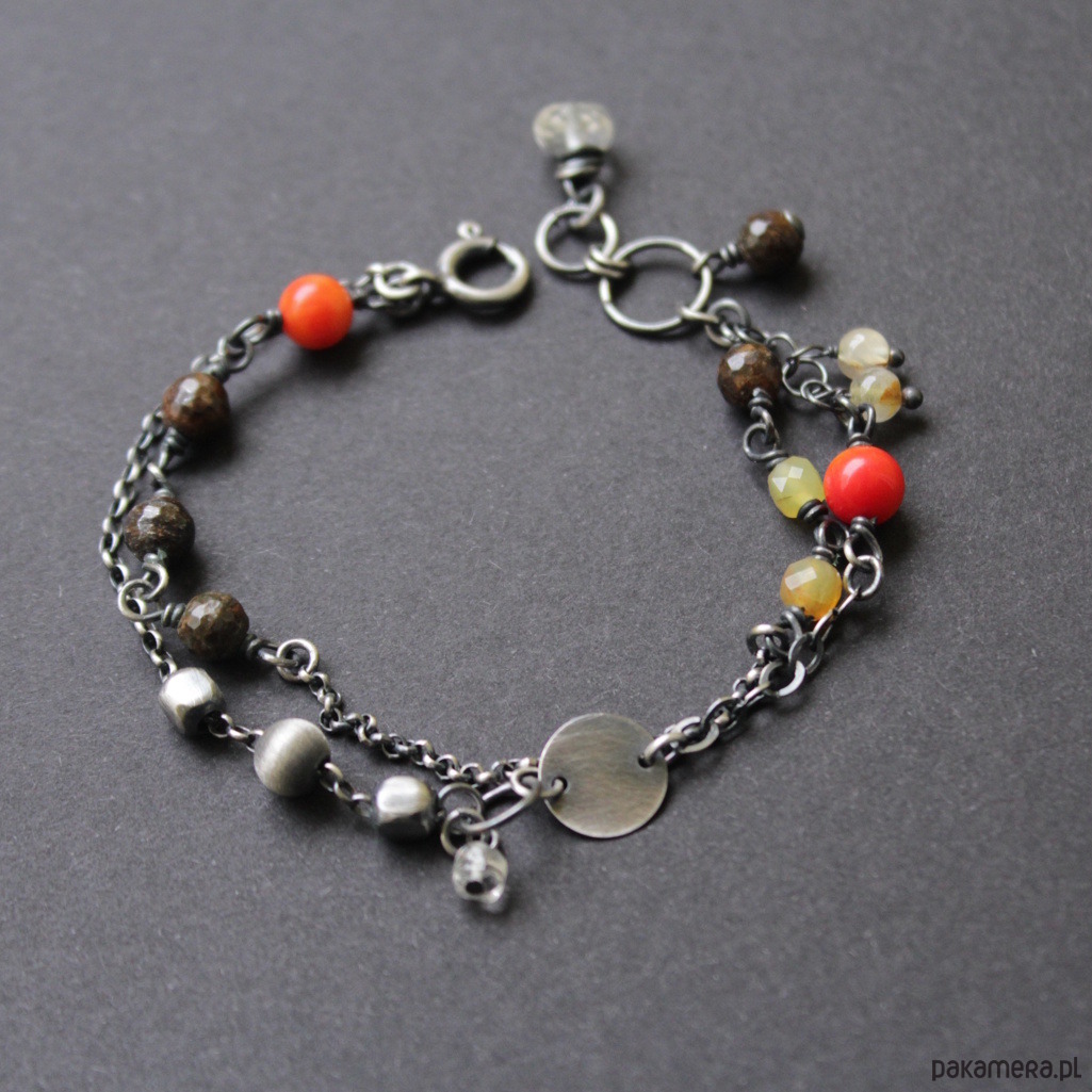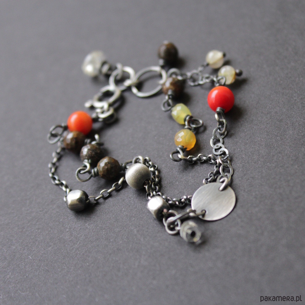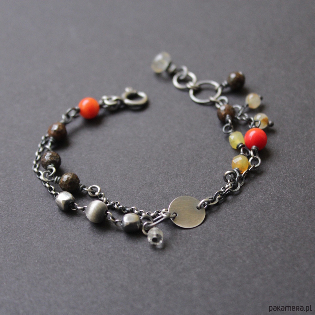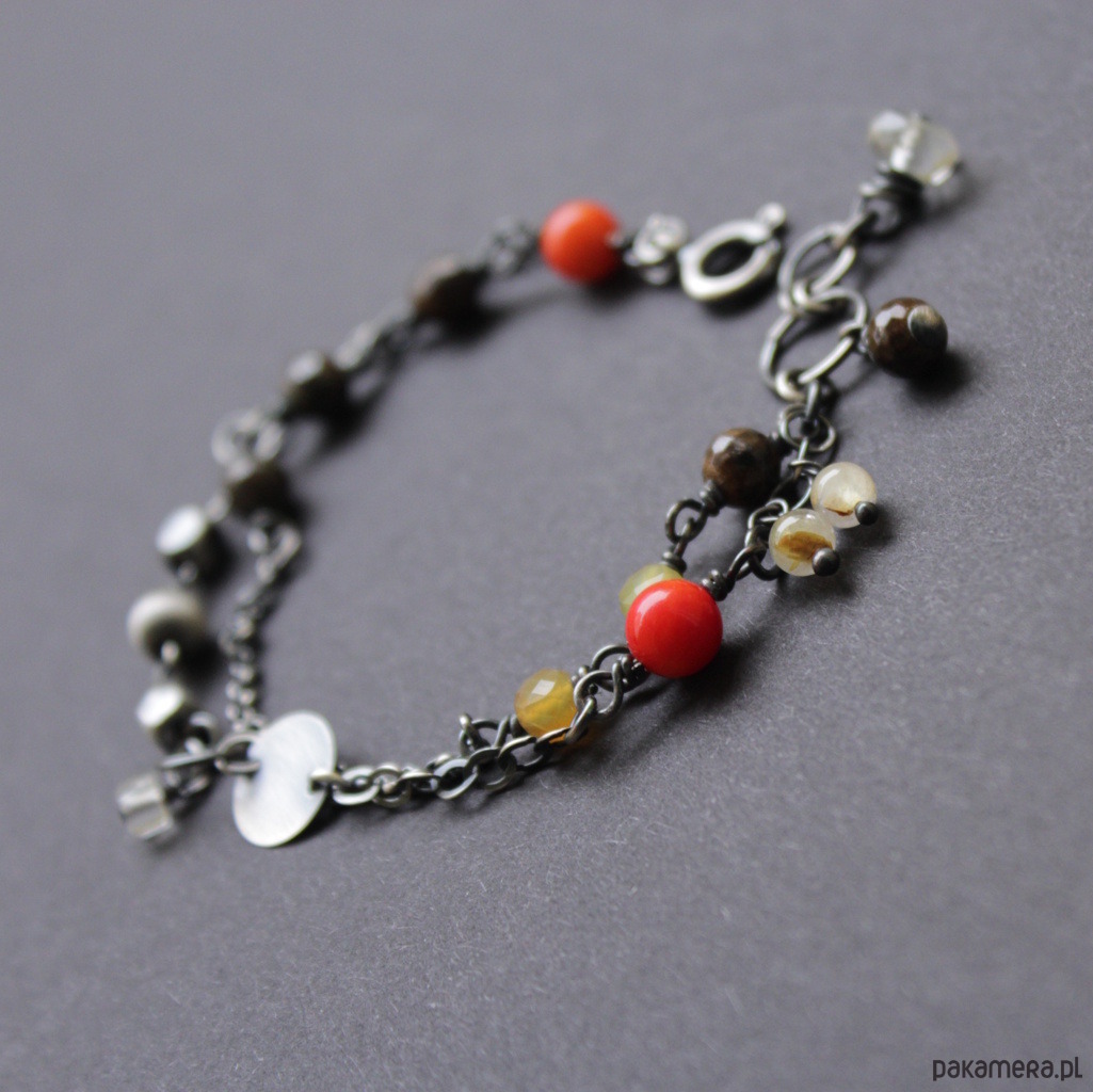 Bransoletka wykonana została z oksydowanego srebra próby 925 oraz kolorowych minerałów: