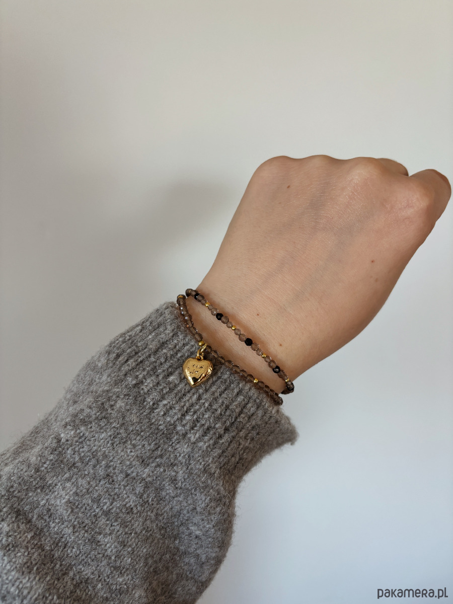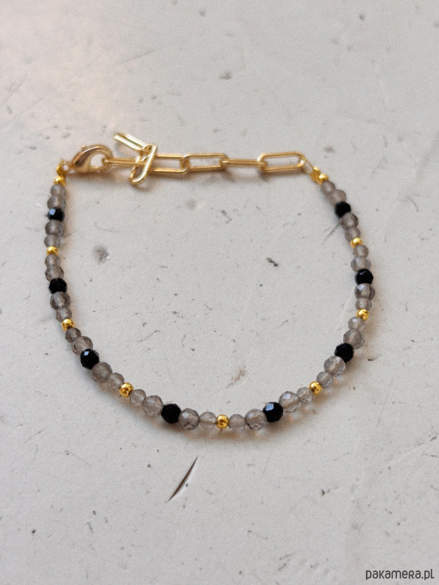 Bransoletka wykonana jest na lince jubilerskiej z użyciem Kwarcu dymnego, pozłacanych przekładek i onyksu,zapięcie wykonane ze stali ch.