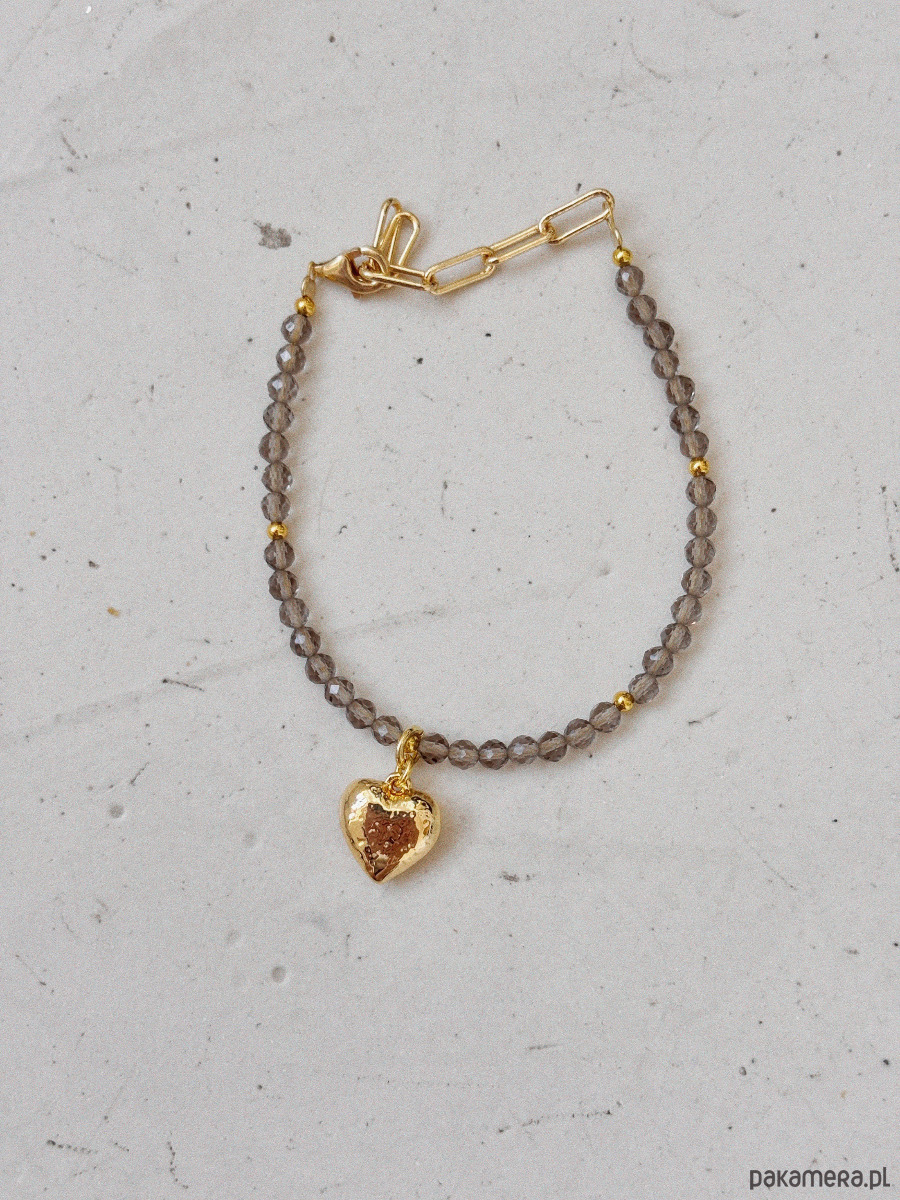 Bransoletka wykonana jest na lince jubilerskiej z użyciem Kwarcu dymnego i zawieszki rodowanej złotem, zapięcie i łańcuszek również.