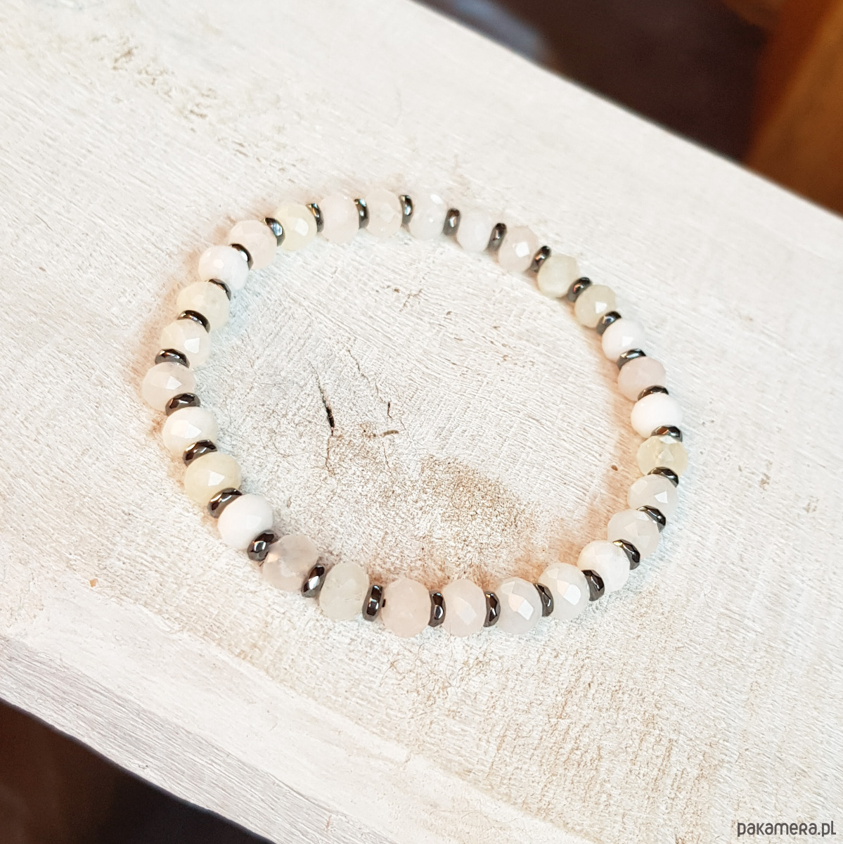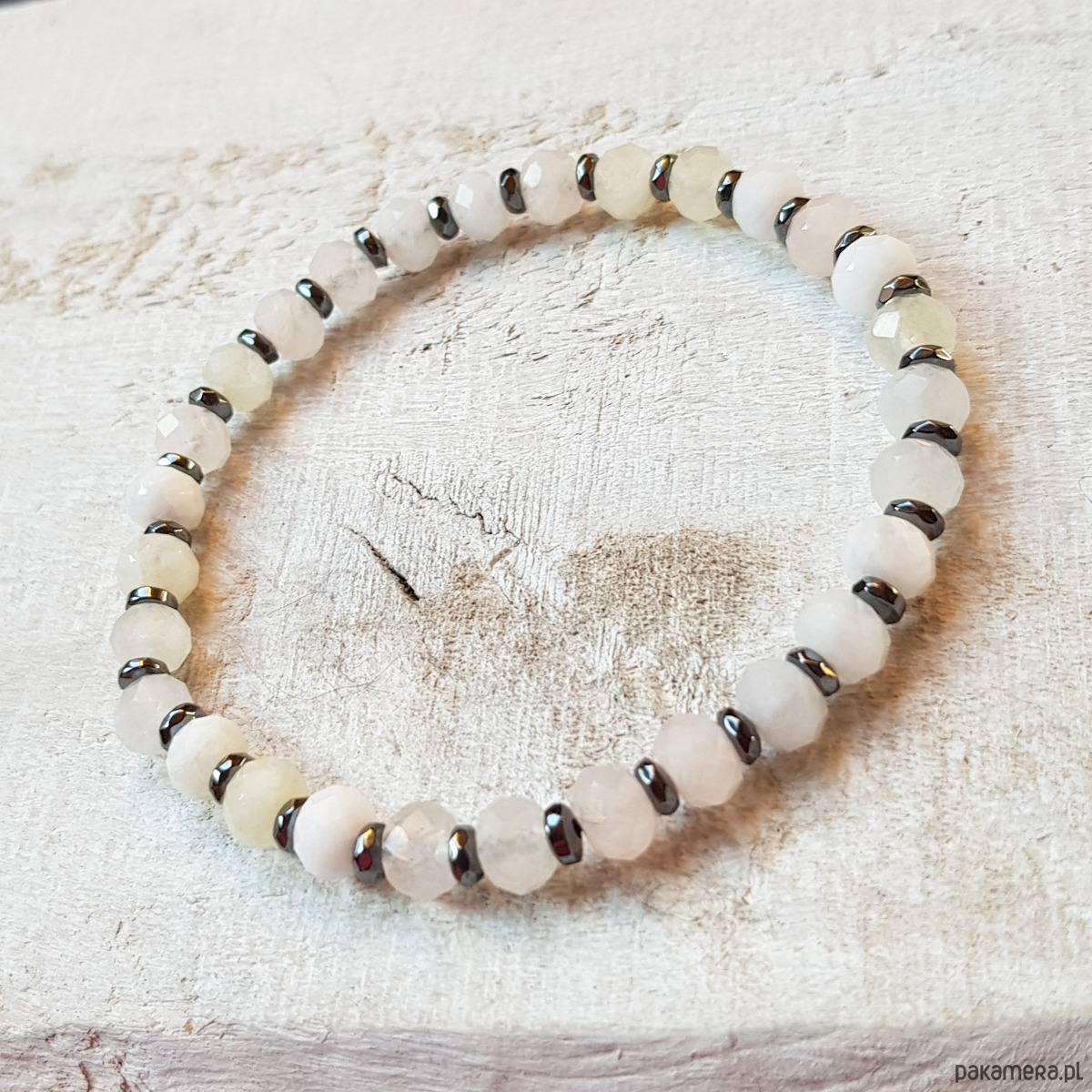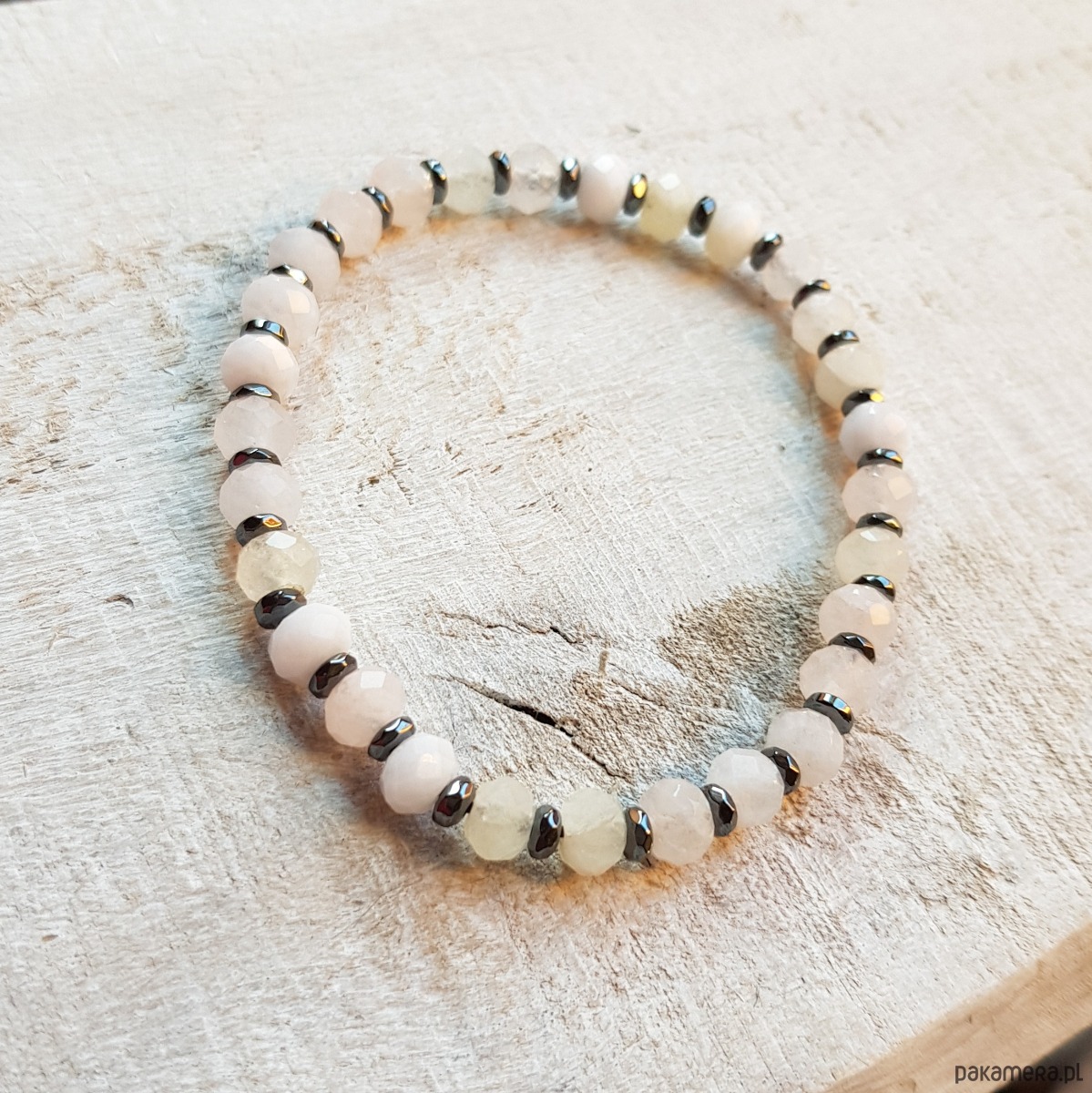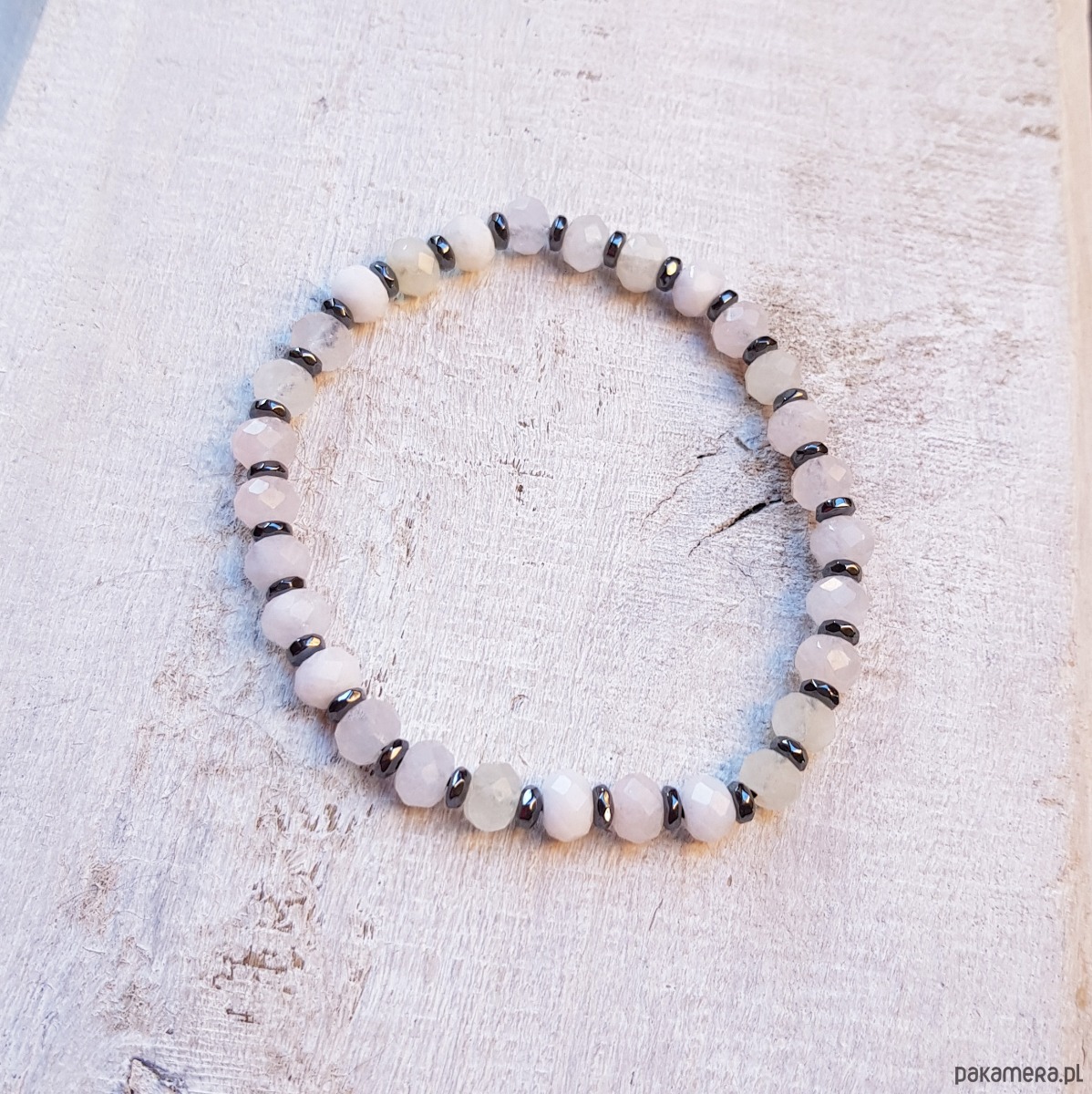 Bransoletka wykonana z wysokiej jakości kamieni kwarcu morganitowego i przekładek hematytu. Kwarc w kształcie fasetowanej oponki 6x4mm w kolorze bardzo jasnej (mlecznej) różu, zieleni, niebieskiej i bieli. Bransoletka o długości 19cm pasuje na nadgarstek o obwodzie 16-18 cm.