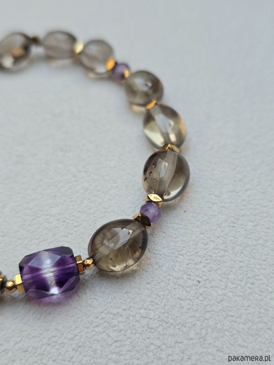 Unikatowa Bransoletka elastyczna z bryłek kwarcu dymnego i ametrynu ze złoconym hemetytem