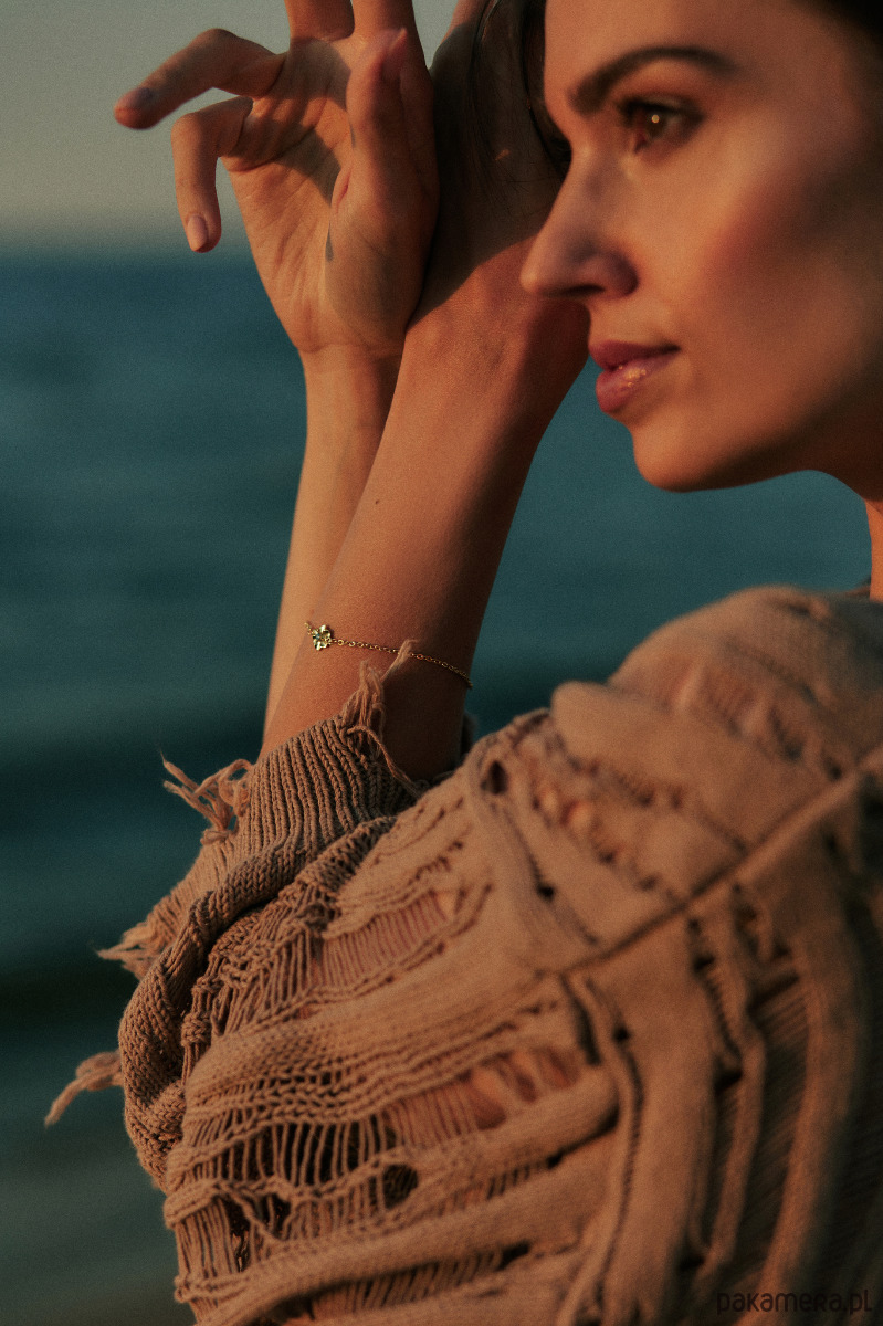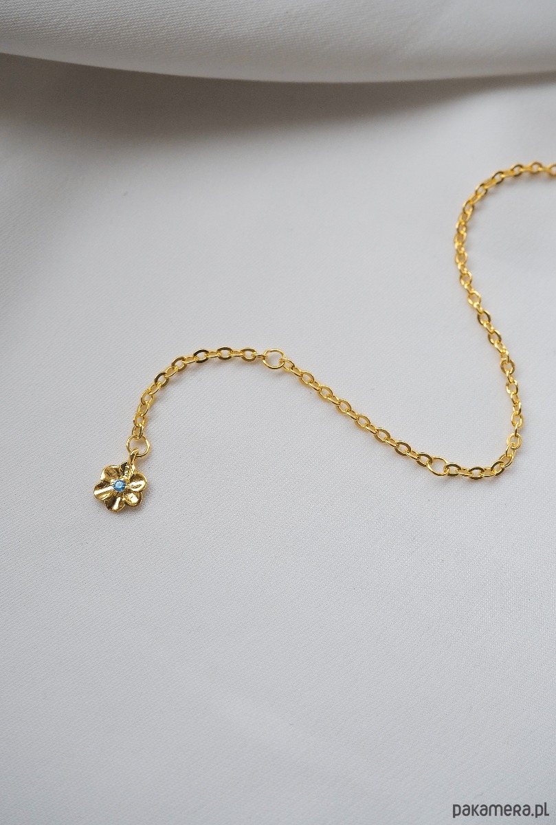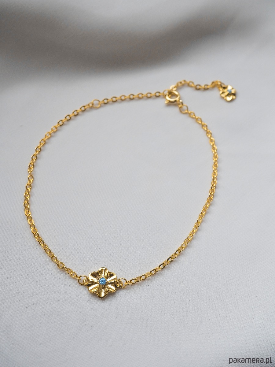 Bransoletka z motywem kwiatu z dodatkiem błękitnej cyrkonii. Wykonana ze srebra o próbie 925 pozłacana 24- karatowym złotem. Posiada regulacje. Zakończona malutką ozdobną zawieszką.
