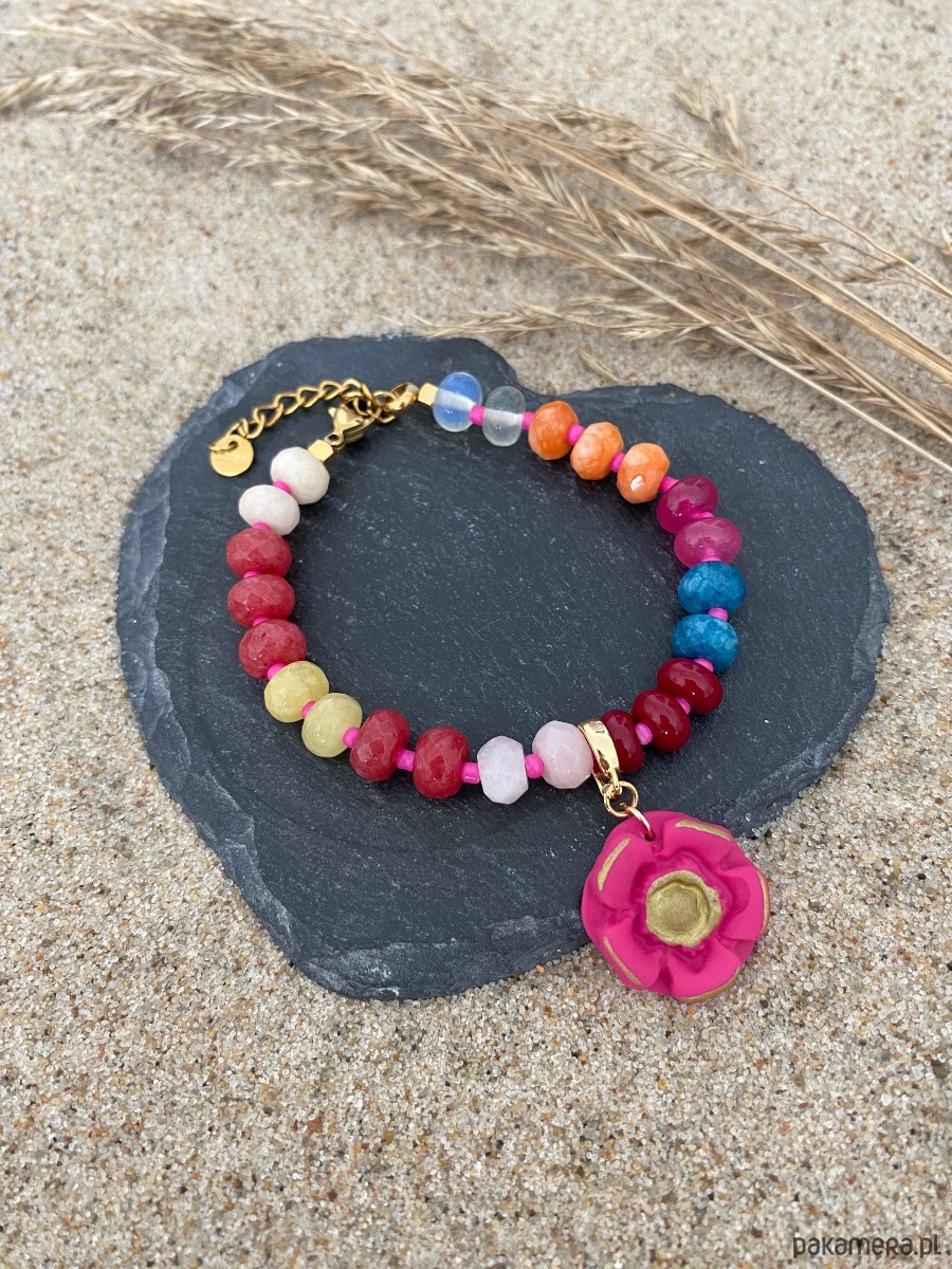 Bransoletka „Kwiatowe Fantazje” to ręcznie robiona ozdoba, która wnosi radość i kolor do każdej stylizacji. Została wykonana z naturalnych, fasetowanych kamieni w odcieniach różu, czerwieni, błękitu i żółci, ozdobiona złotymi akcentami i unikatową zawieszką w kształcie kwiatka z modelowanej ręcznie gliny polimerowej.