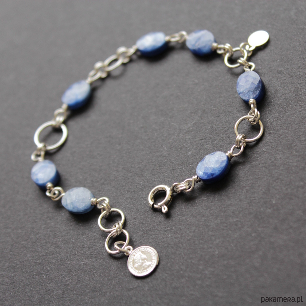 Bransoletka wykonana została ze srebra próby 925 oraz owalnych, fasetoanych kyanitów wielkości surowych bryłek jsnych labradorytów wielkości 0,9x0,7 cm.