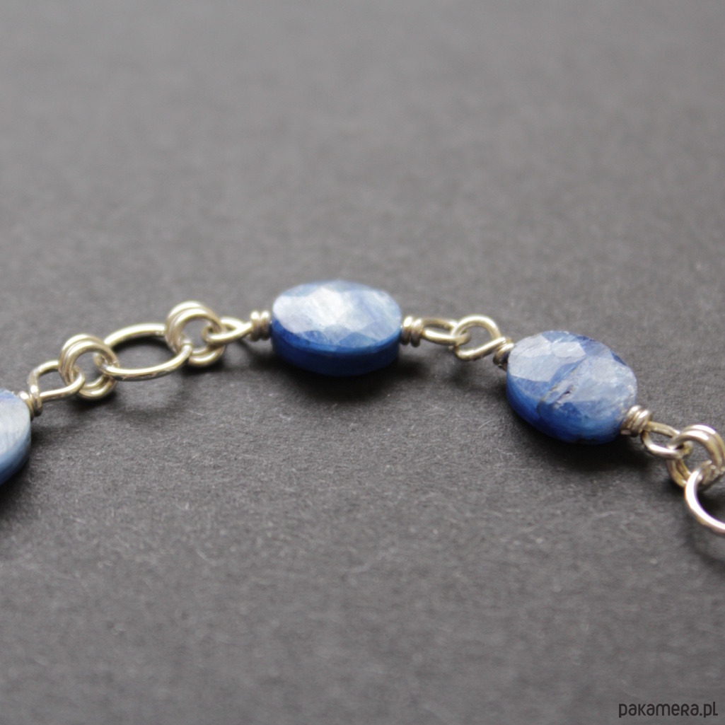 Bransoletka wykonana została ze srebra próby 925 oraz owalnych, fasetoanych kyanitów wielkości surowych bryłek jsnych labradorytów wielkości 0,9x0,7 cm.