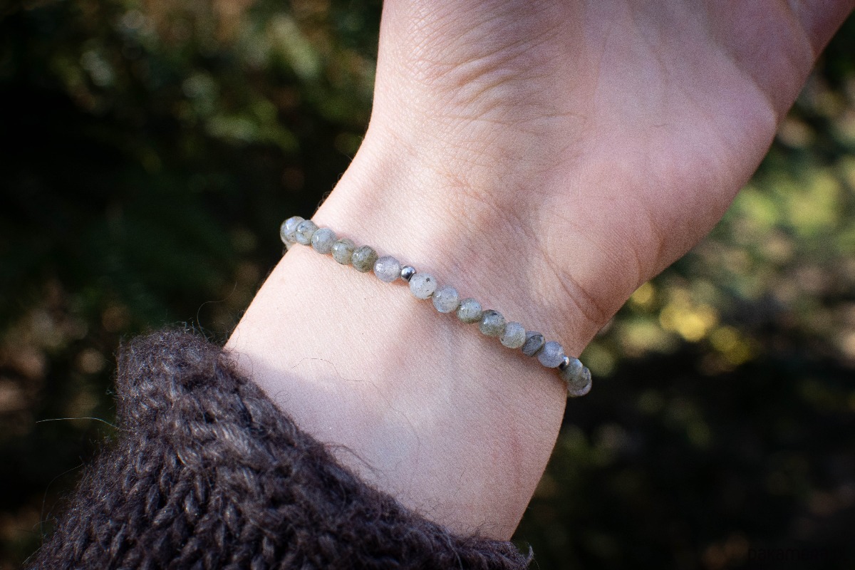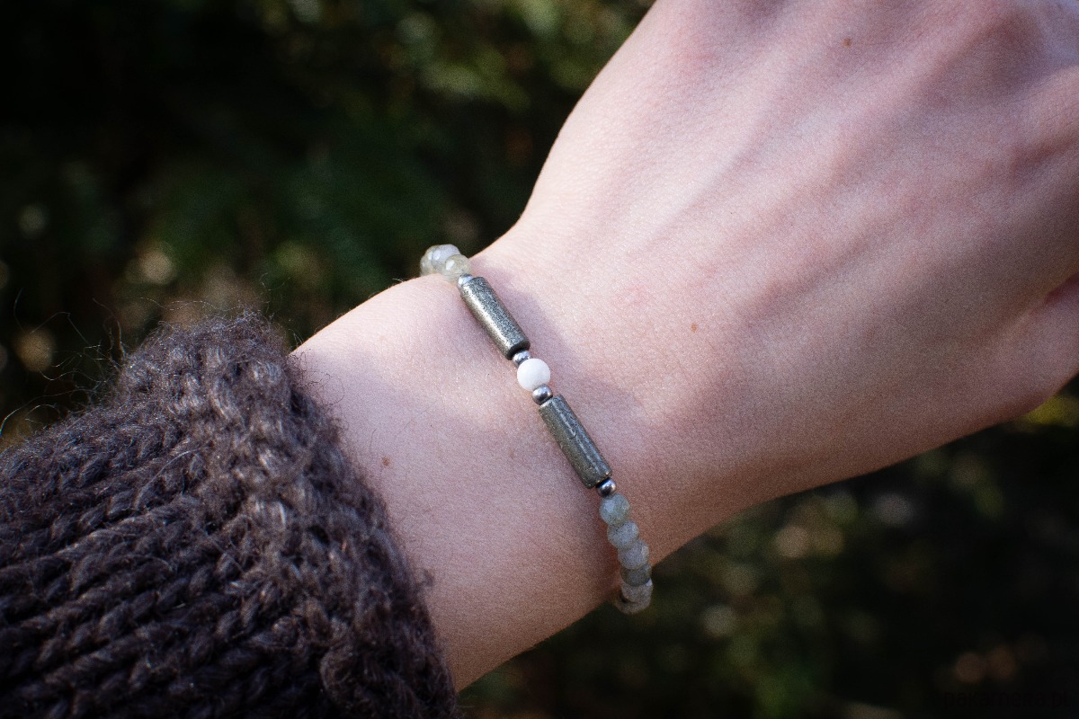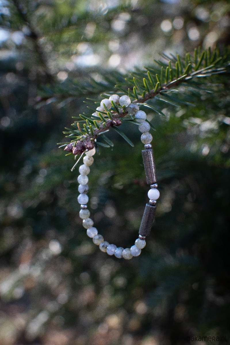 Materiały ~ elastyczna gumka jubilerska, labradoryt fasetowany, piryt, hematyty, kwarc.