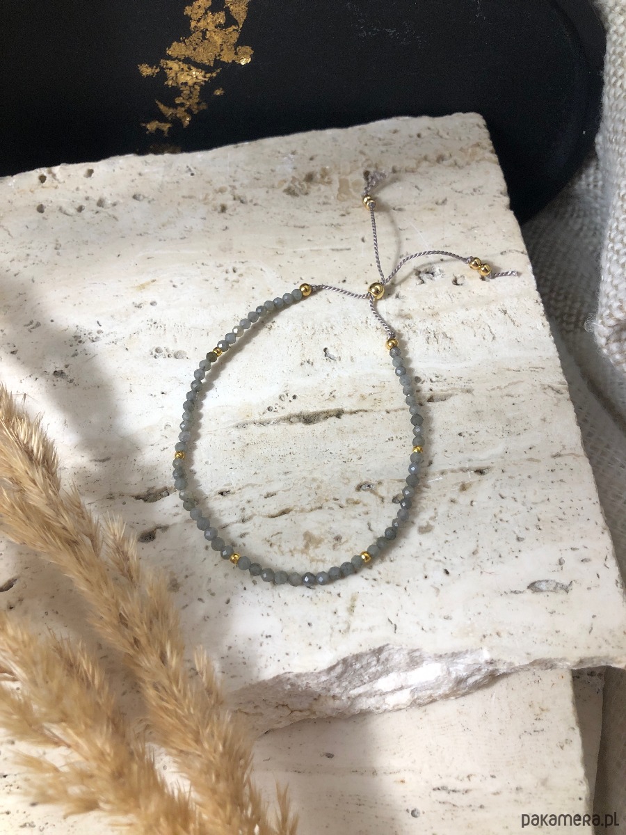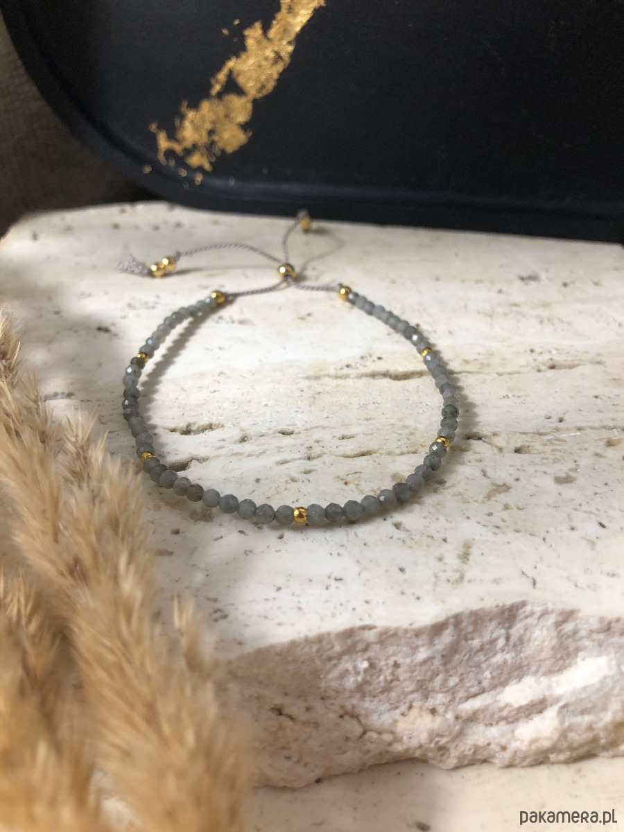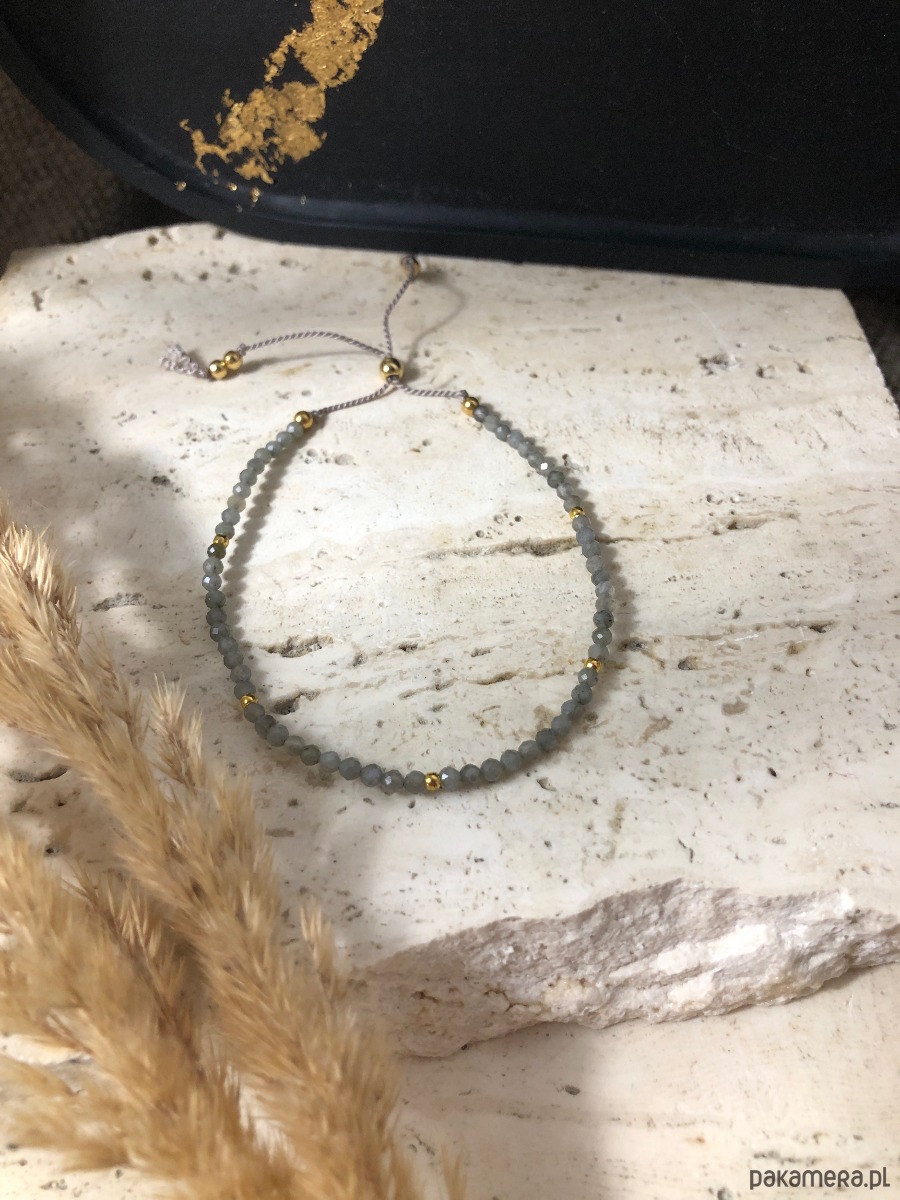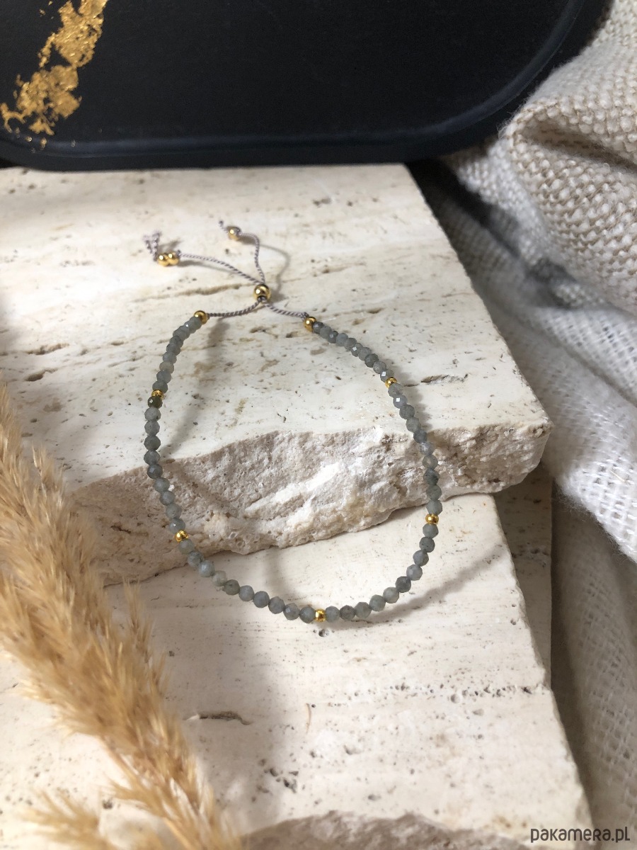 Bransoletka wykonana z kamieni naturalnych. Na nić jedwabną nawleczono labradoryt 2,5 - 3 mm i kuleczki ze stali chirurgicznej w kolorze złotym. Obwód bransoletki można regulować za pomocą przesuwanego stopera z gumką w środku.