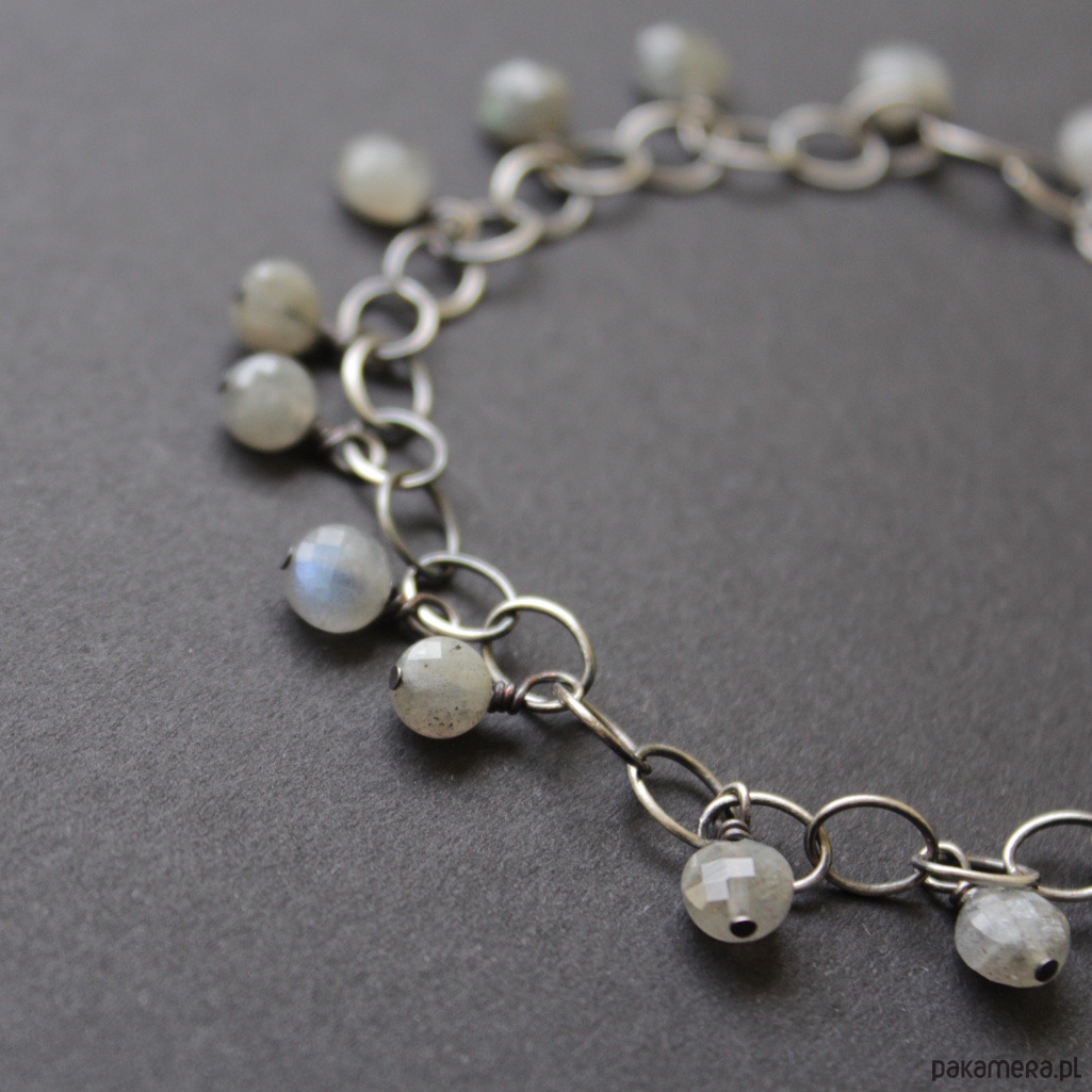 Bransoletka wykonana została z oksydowanego srebra oraz fasetowanych monet labradorytów wielkości 0,5 cm