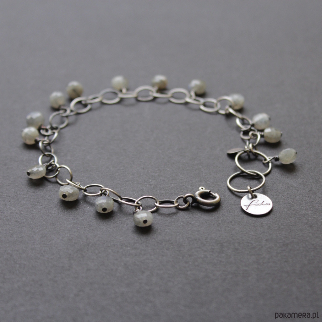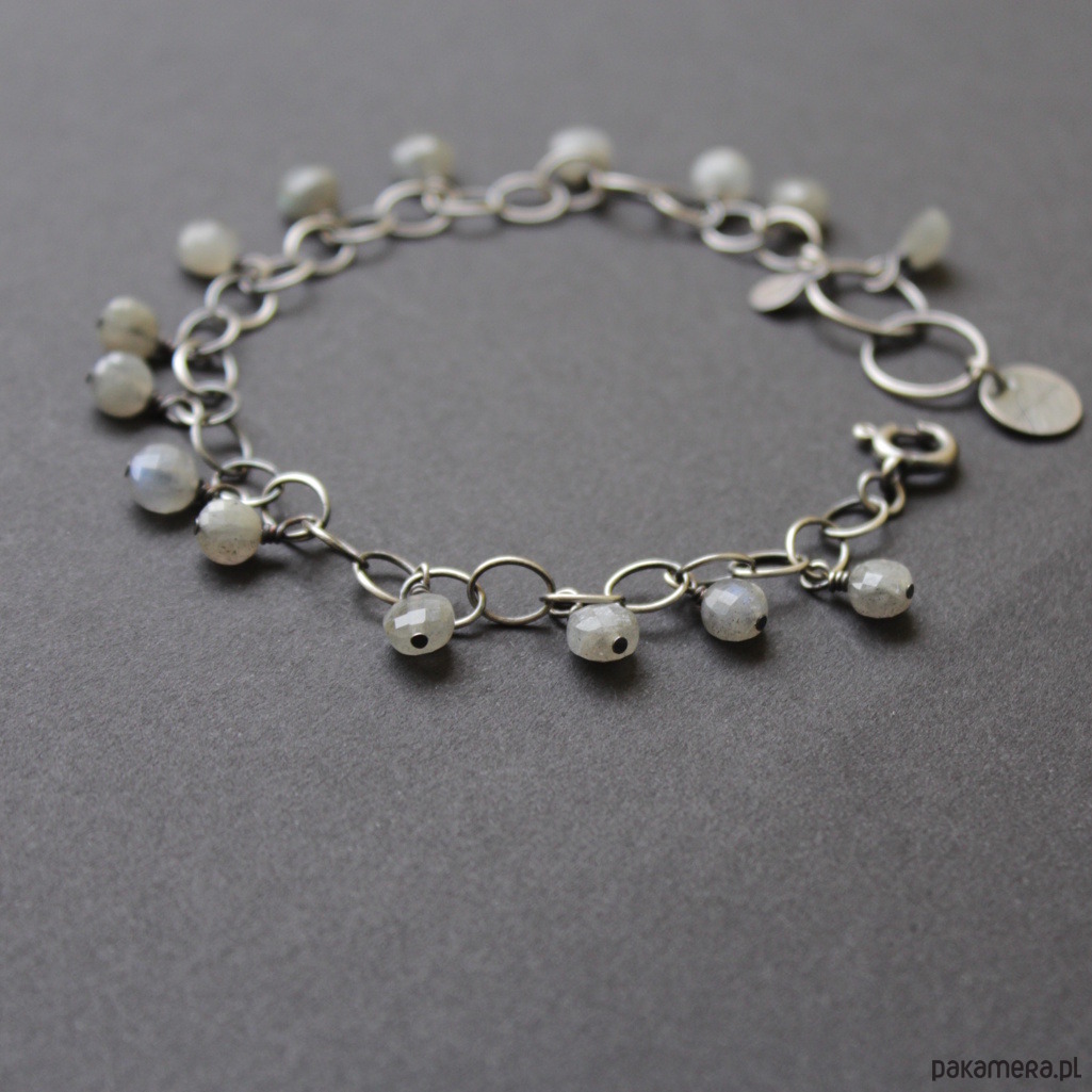 Bransoletka wykonana została z oksydowanego srebra oraz fasetowanych monet labradorytów wielkości 0,5 cm