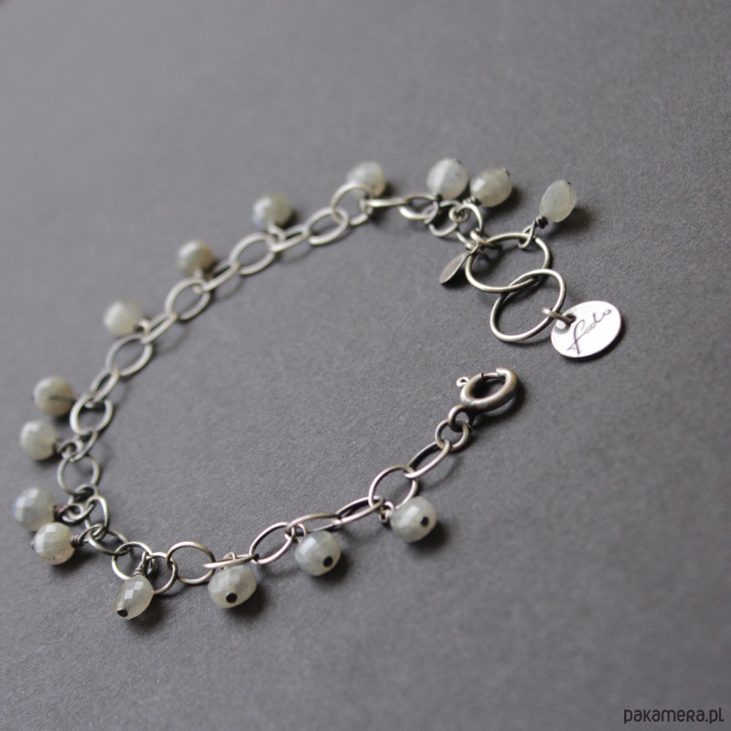 Bransoletka wykonana została z oksydowanego srebra oraz fasetowanych monet labradorytów wielkości 0,5 cm