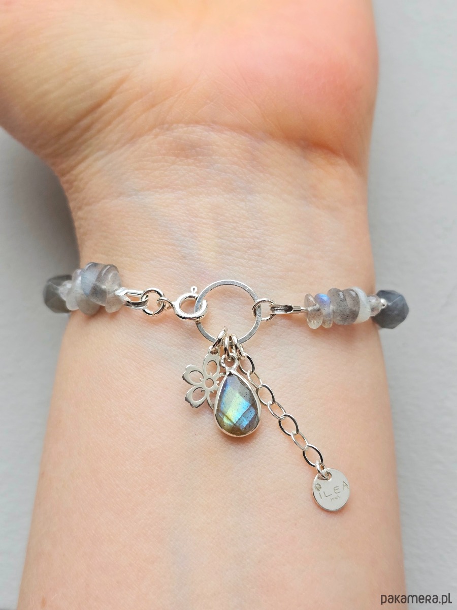 Wyjątkowa, sygnowana bransoletka z różnych kształtów labradorytów, z mieniącymi się refleksami. Ozdobą jest piękna zawieszka w kształcie łezki i ażurowy kwiatek.