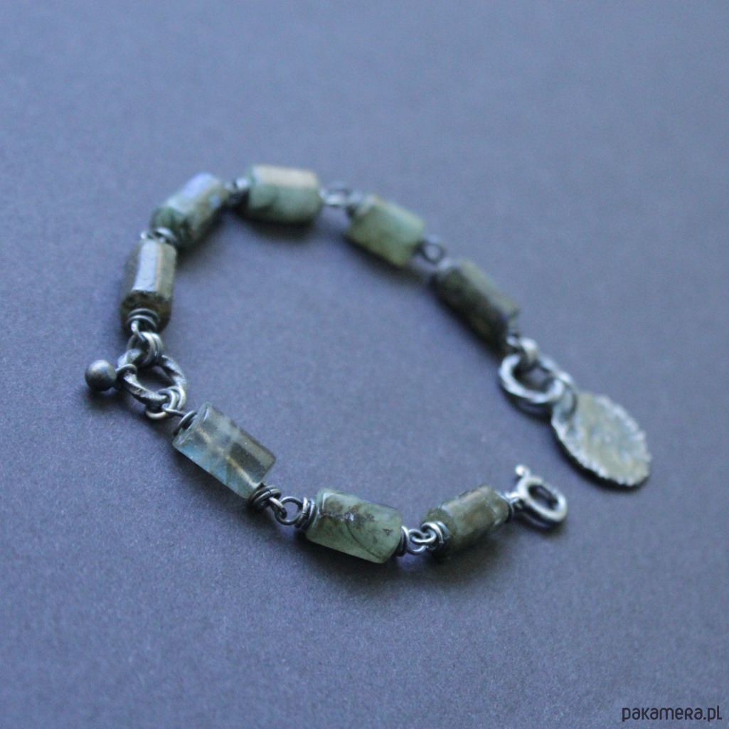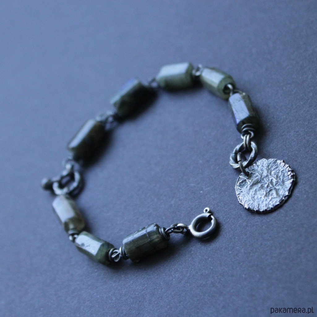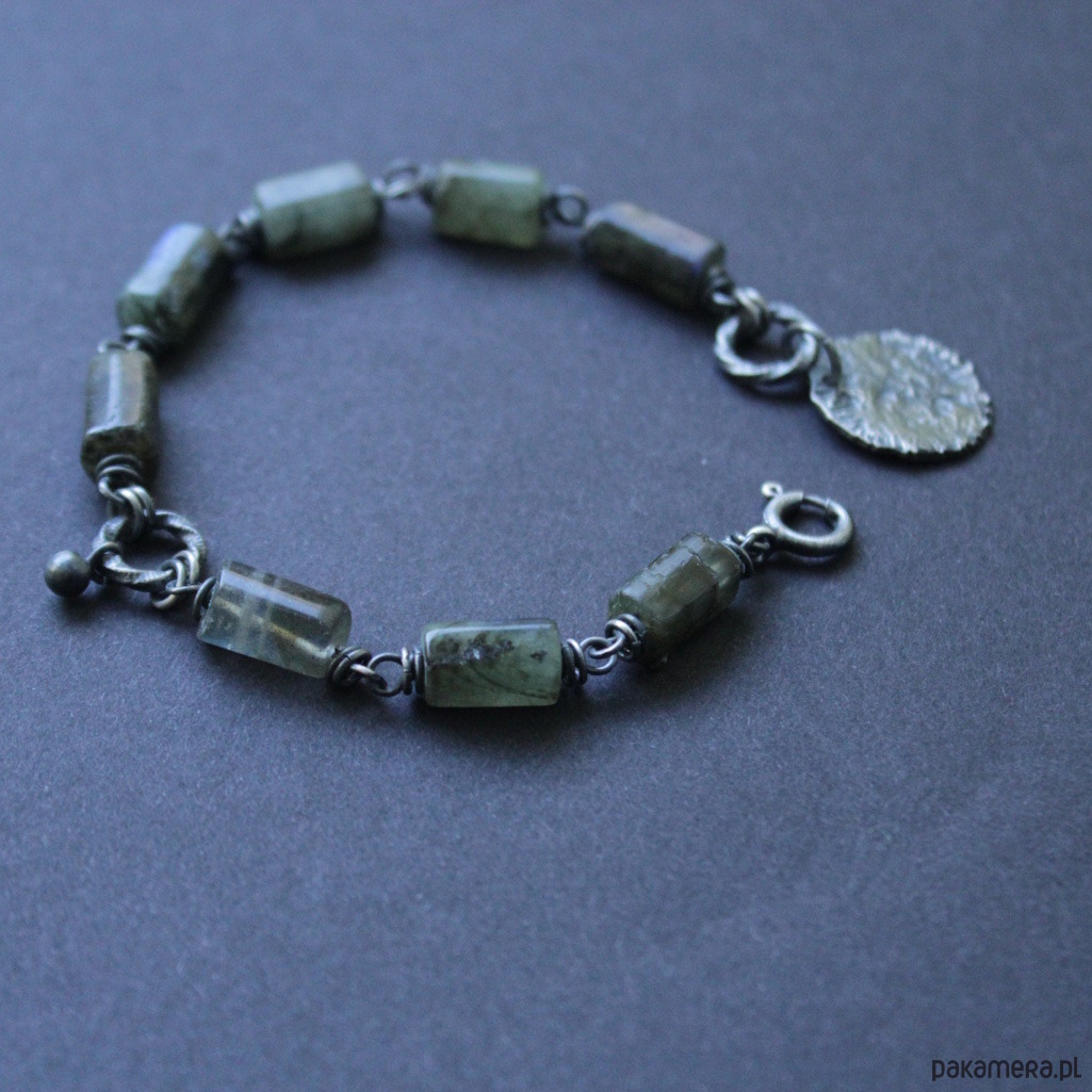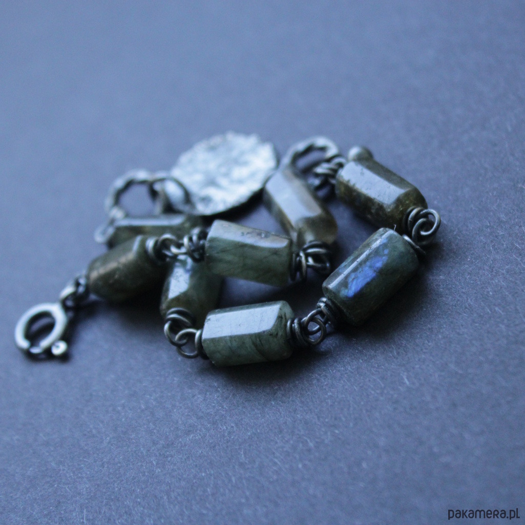 Bransoletka została wykonana zoksydowanego srebra próby 925 oraz przepięknych bryłek labradorytów wielkości 0,8-1 cm.
