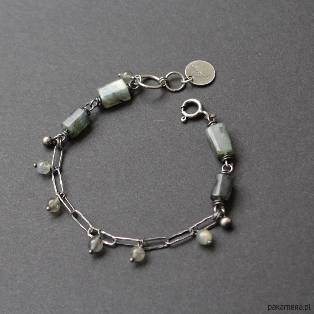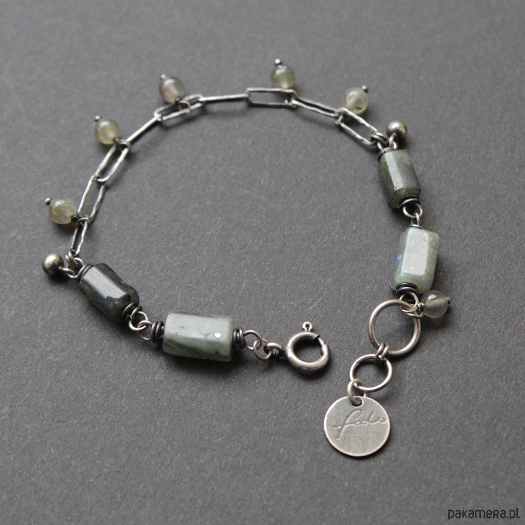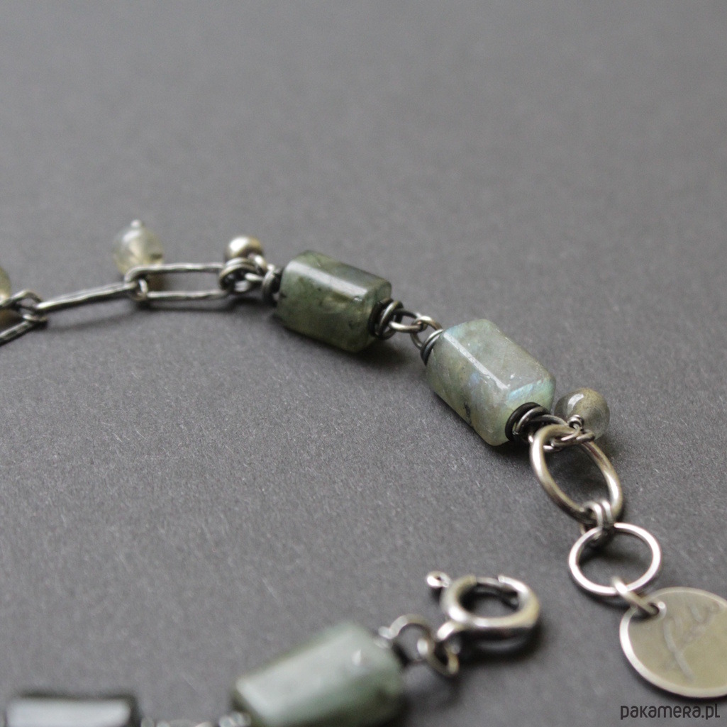 Bransoletka została wykonana ze srebra próby 925 oraz przepięknych bryłek labradorytów wielkości 0,8-1 cm oraz kuleczek labradorytów 0,4 cm.