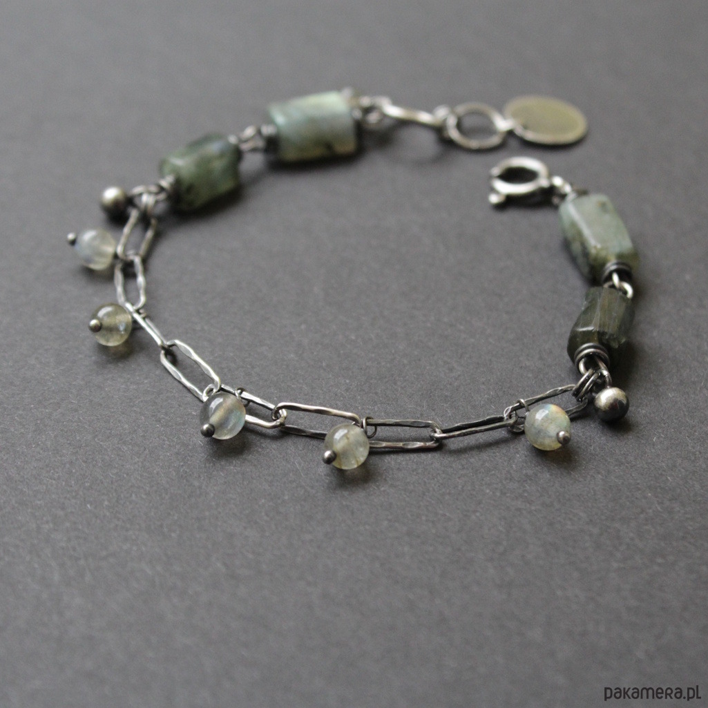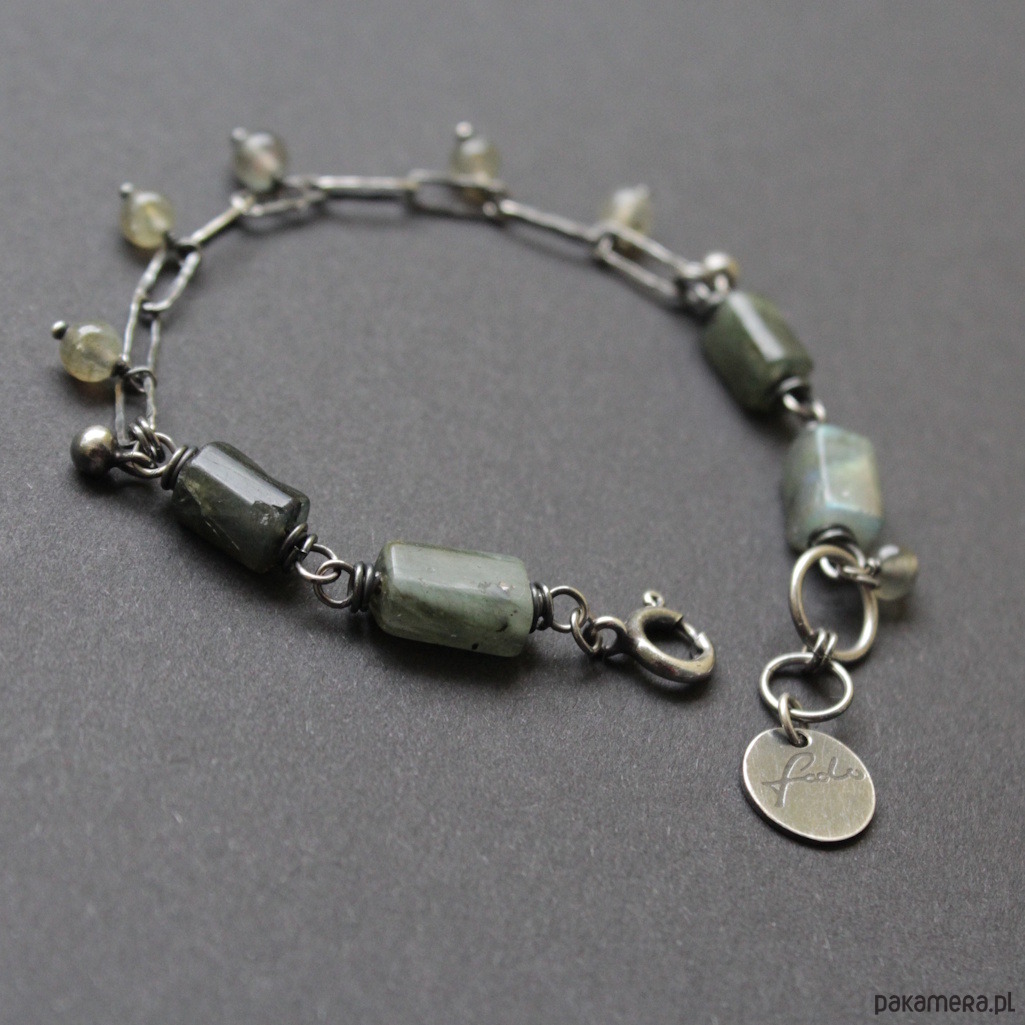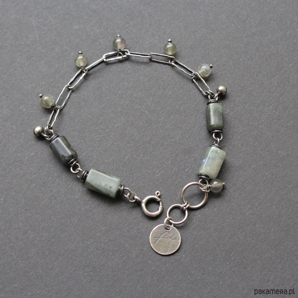 Bransoletka została wykonana ze srebra próby 925 oraz przepięknych bryłek labradorytów wielkości 0,8-1 cm oraz kuleczek labradorytów 0,4 cm.