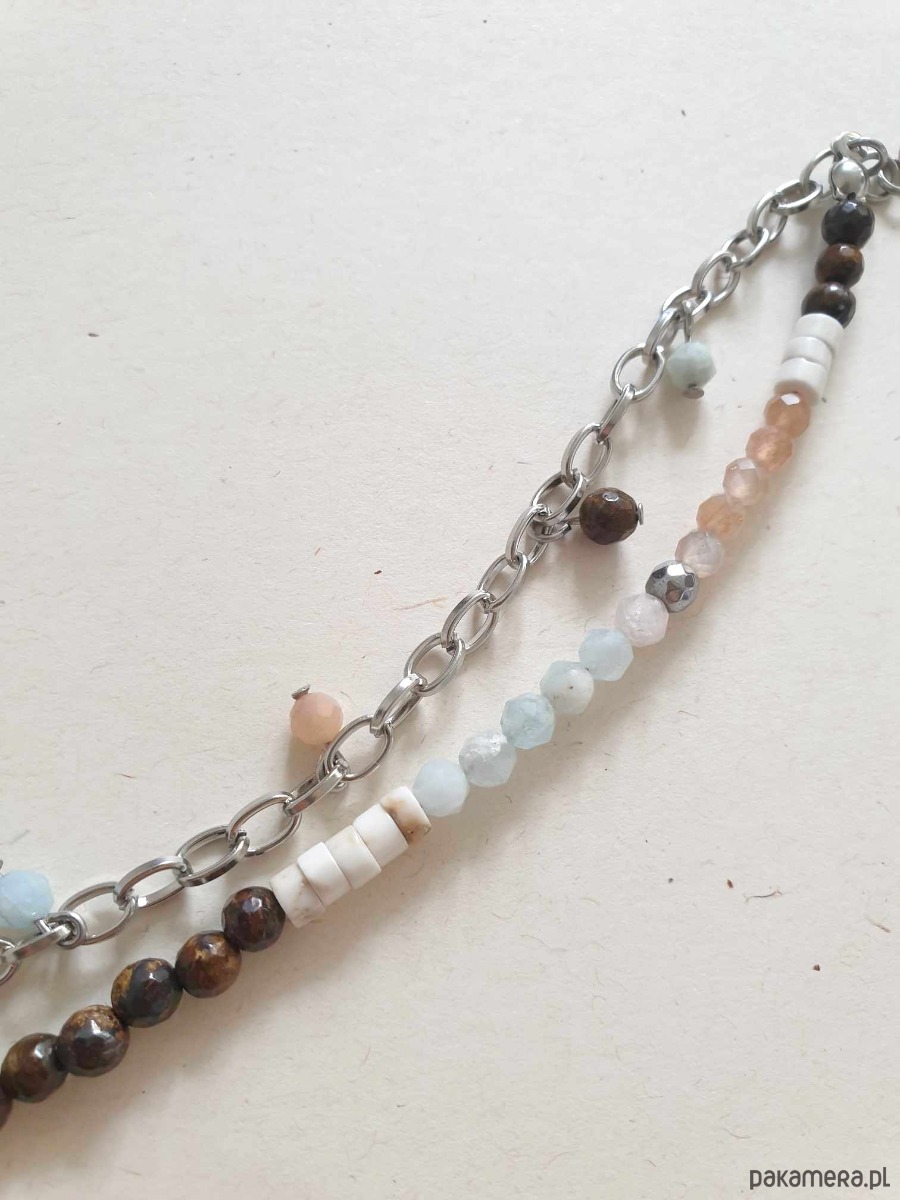 Bransoletka podwójna z łańcuszkiem i kulkami, tworzona ręcznie z kamieni naturalnych, elementów ze stali szlachetnej (antyalergicznej) W tej - fasetowany morganit, bronzyt, kamień słoneczny, howlit, hematyt.