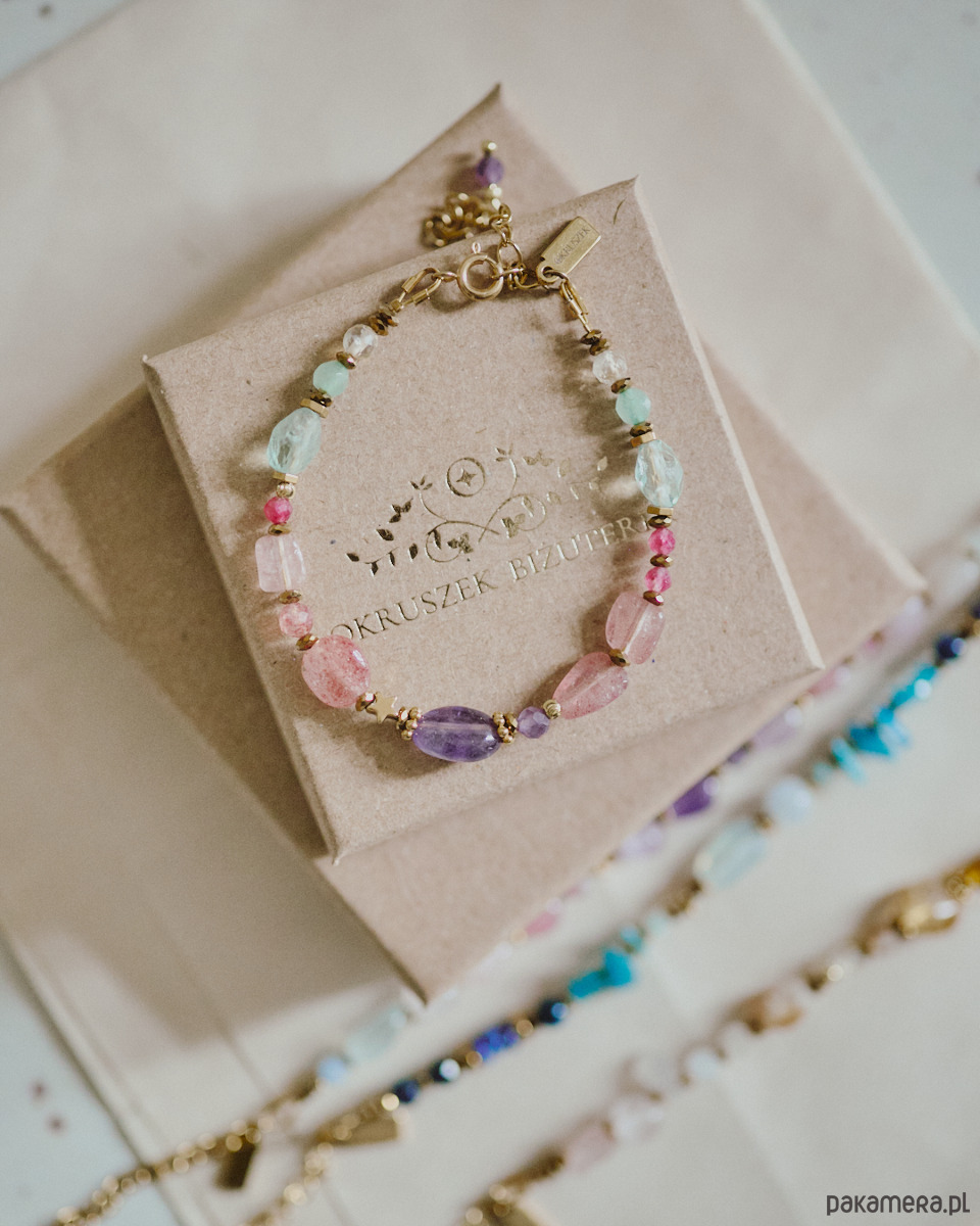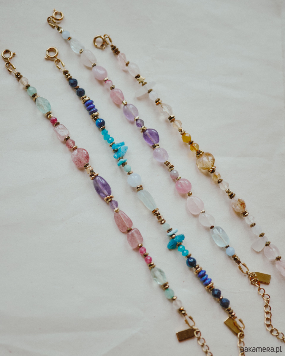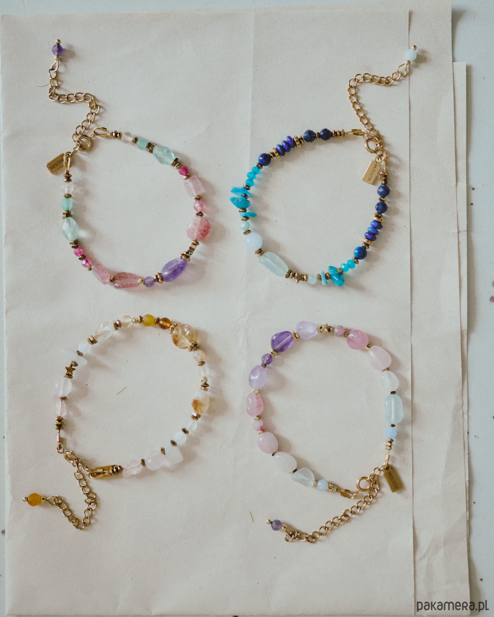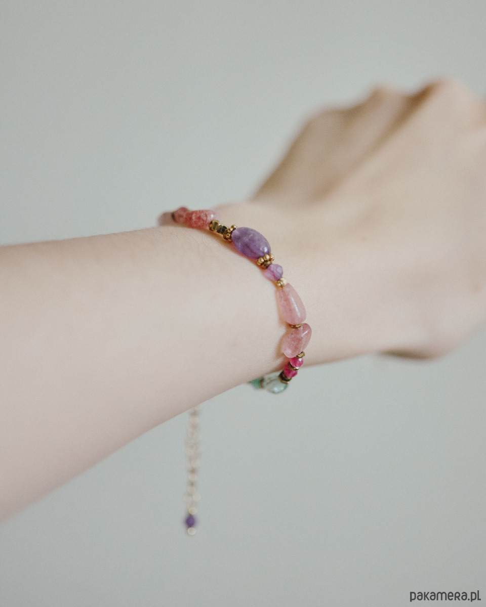 To nie jest biżuteria dla minimalistek, tu jest 𝓹𝔂𝓼𝔃𝓷𝓲𝓮. Wszystko zamknięte jest jednak w eleganckim kształcie bransoletki. Kolorów jest dużo ale są uporządkowane i dopasowane ze smakiem. Przechodzą od fioletowego, przez truskawkowy róż, fuksję, po miętową zieleń.