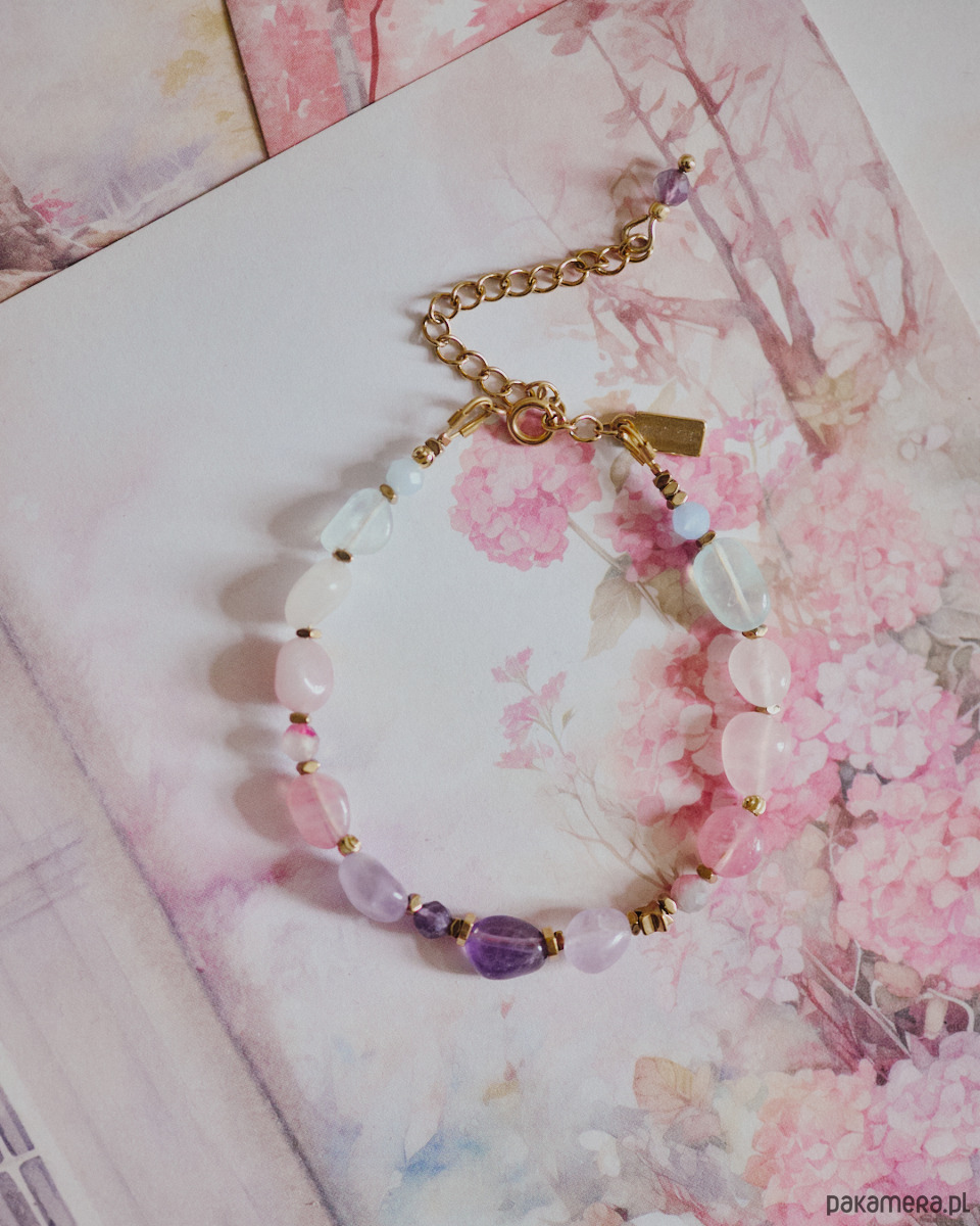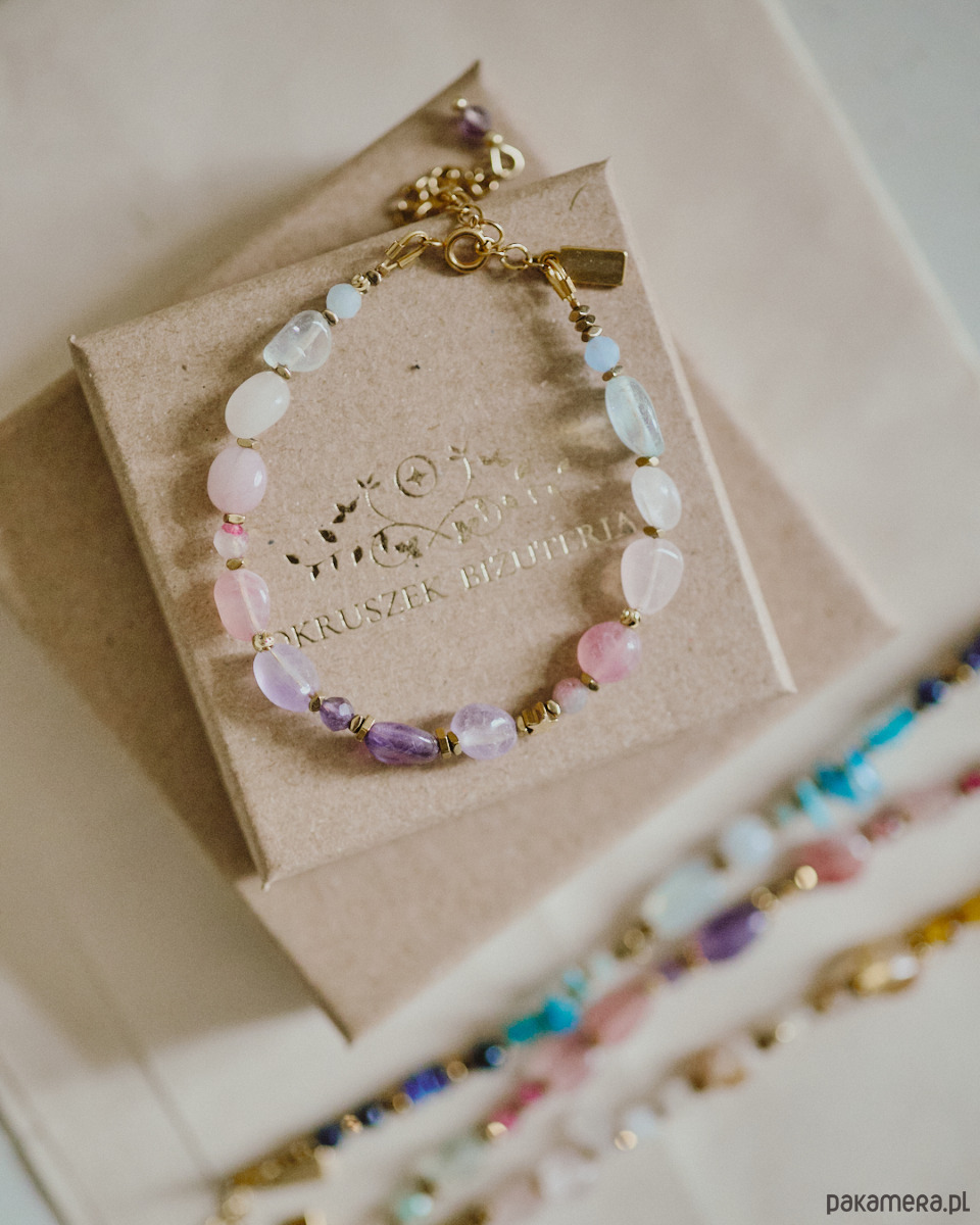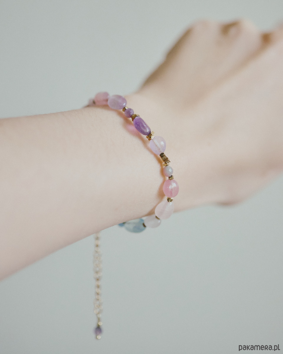 To nie jest biżuteria dla minimalistek, tu jest 𝓹𝔂𝓼𝔃𝓷𝓲𝓮. Wszystko zamknięte jest jednak w eleganckim kształcie bransoletki. Kolorów jest dużo ale są uporządkowane i dopasowane ze smakiem. Przechodzą od ciemnego fioletu w jasny, przez różowy, po błekitny.