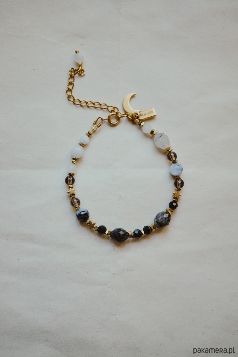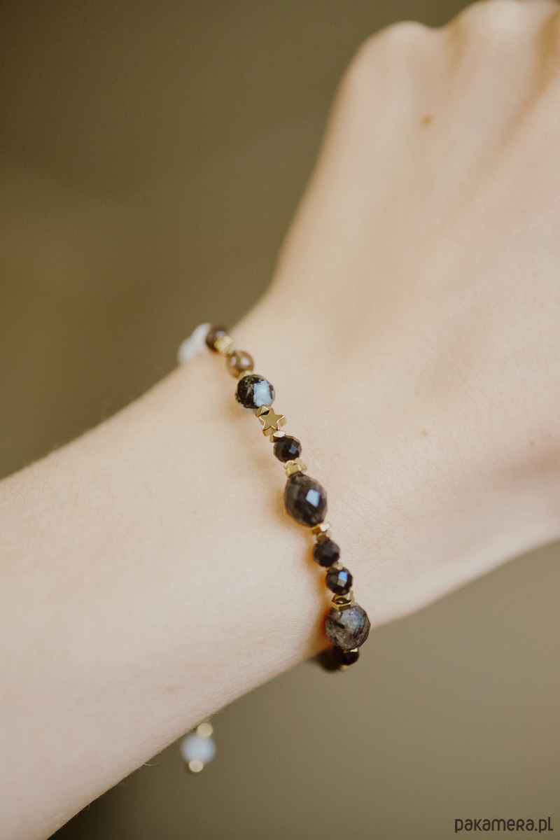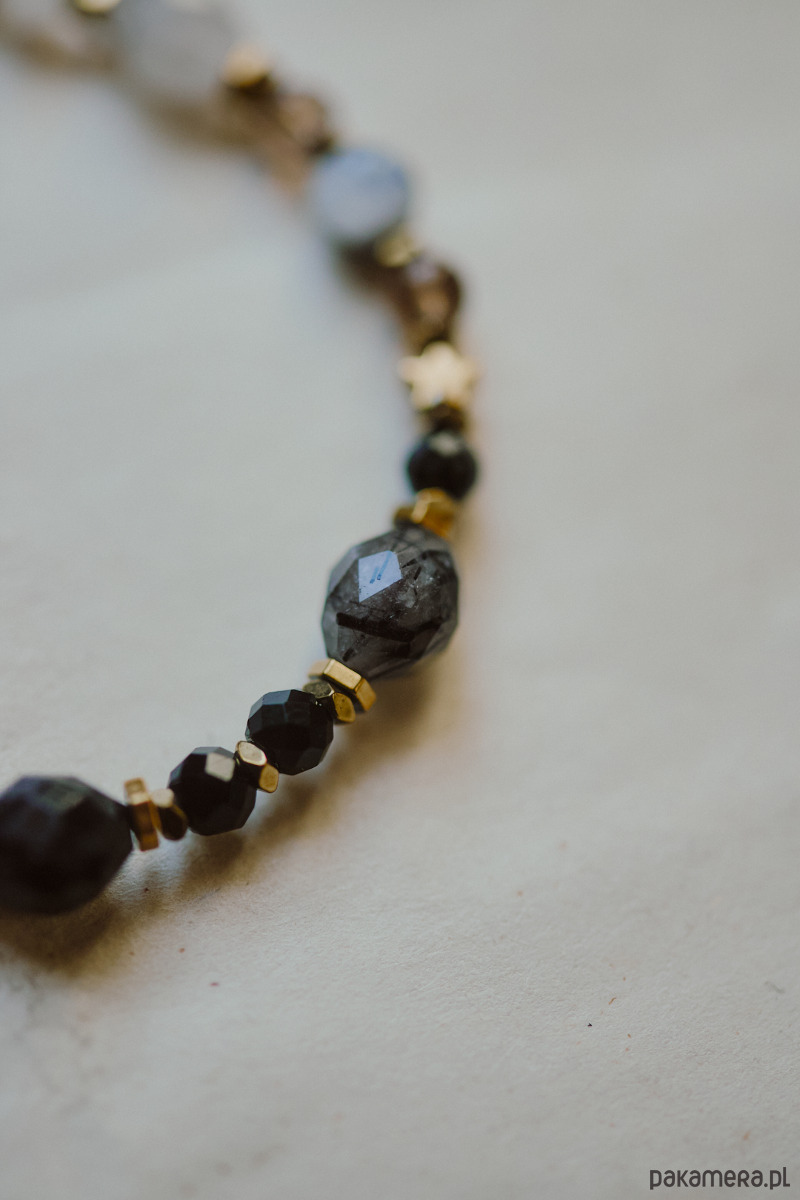 Składniki: zjawiskowy kwarc z kawałkami czarnego rutylu wewnątrz, onyks, kamień księżycowy, kwarc dyny, hematyt.