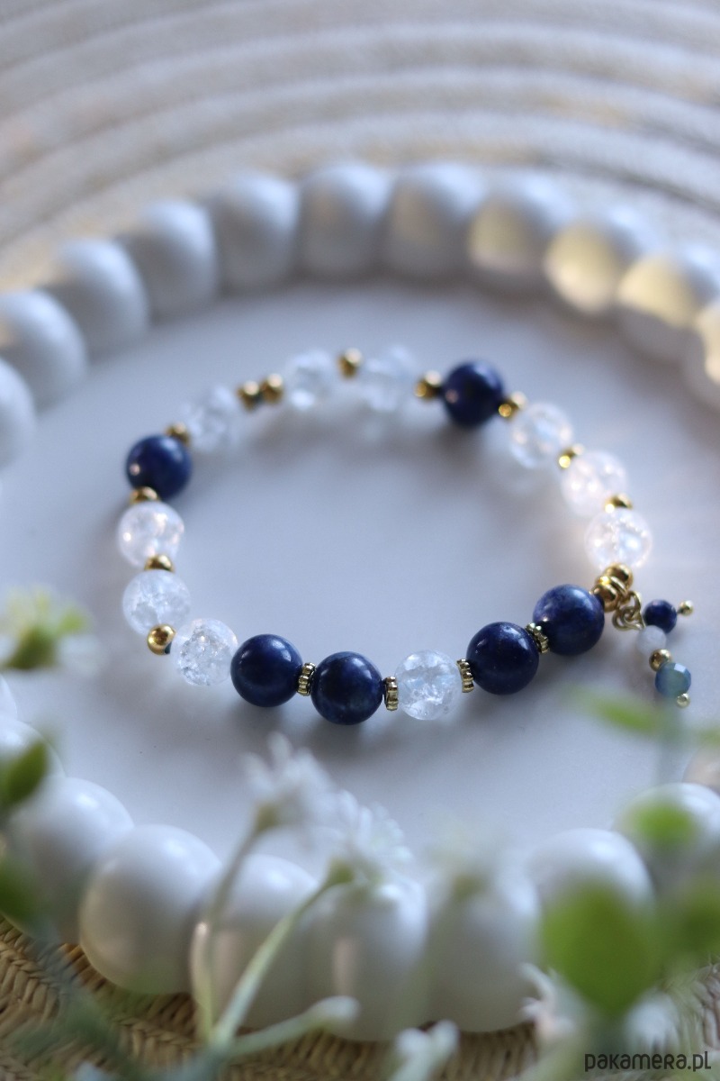 Ręcznie wykonana, unikatowa bransoletka stworzona z naturalnych kamieni Lapis Lazuli i Kryształu Górskiego. Każdy element został starannie dobrany, aby tworzyć harmonijną i elegancką kompozycję.