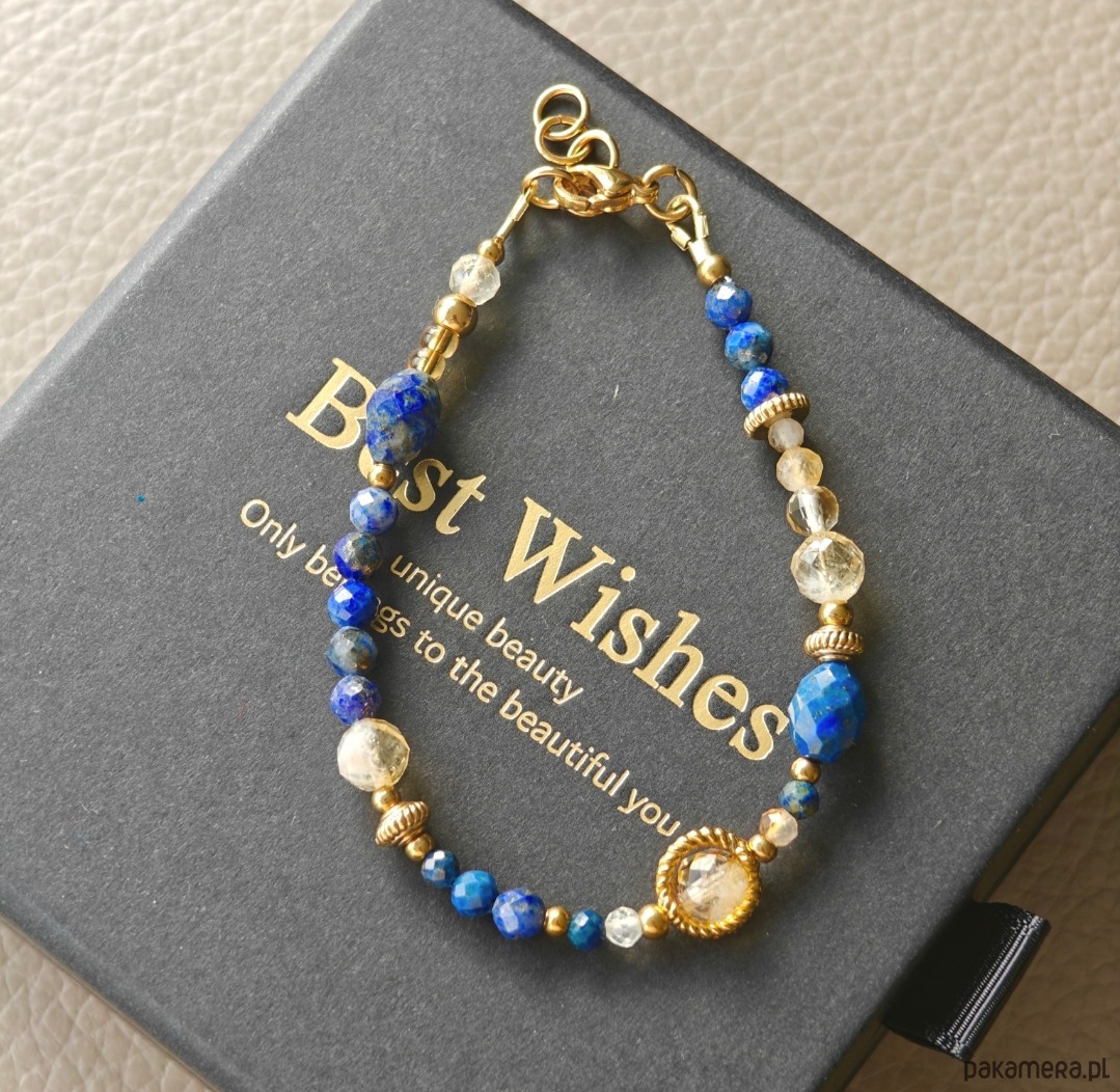 Połączenie kamieni w odcieniach głębokiego granatu, złota i przejrzystej bieli tworzy elegancką, harmonijną kompozycję. Lapis lazuli symbolizuje mądrość i wewnętrzną równowagę, cytryn dodaje energii i optymizmu, a kryształ górski oczyszcza i wzmacnia ich działanie.