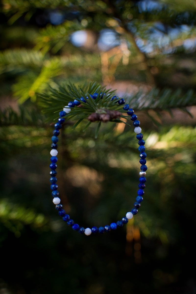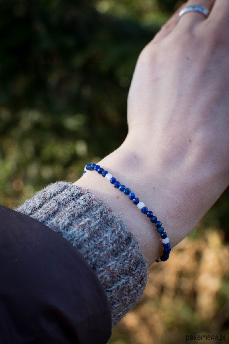 Materiały ~ elastyczna gumka jubilerska, lapis lazuli fasetowany, kamień księżycowy fasetowany, srebrny element ze stali szlachetnej.
