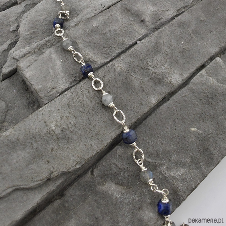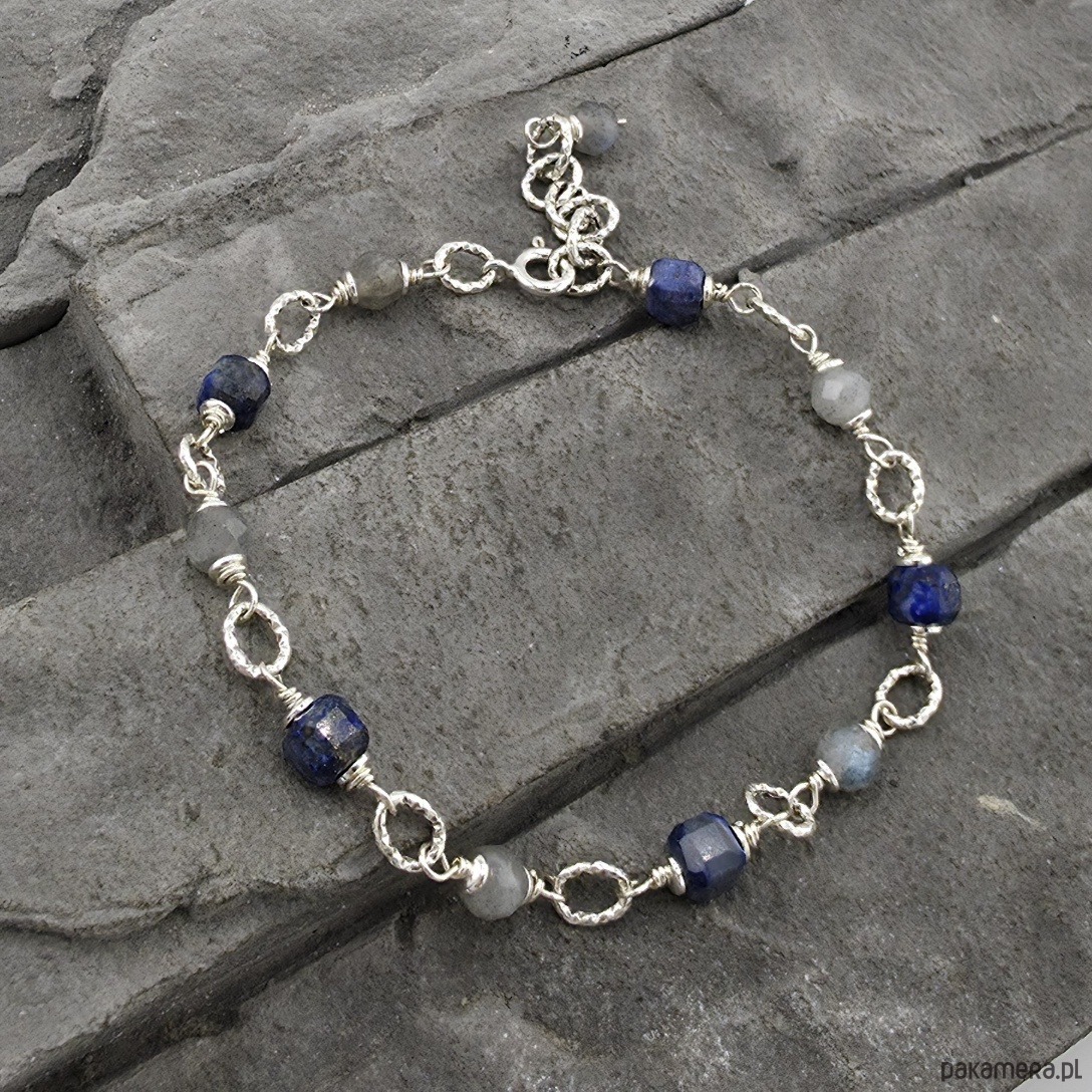 Minimalistyczna i kobieca bransoletka na co dzień. Wykonana w całości ze srebra próby 925 oraz fasetowanych kostek lapisu lazuli i kulek labradorytu wielkości 5 mm. Całkowita długość bransoletki regulowana od 18,5 cm do 20,5 cm. Moge ją także zoksydować lub zrobic naszyjnik do kompletu. Ozdobnie zapakowana.
