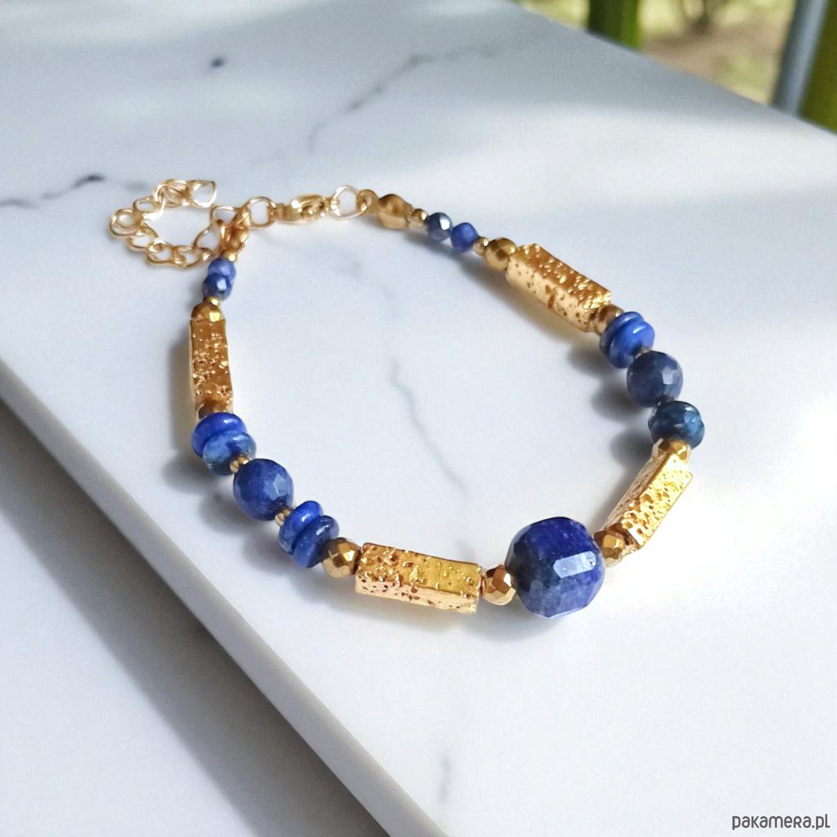 Zjawiskowa bransoletka na solidnej lince stalowej (miękkiej) - została wykonana z fasetowanej kostki (ok.9-10mm), kul, i plasterków lapis lazuli, złotej lawy wulkanicznej i złotego hematytu (3mm) o ciekawym szlifie.