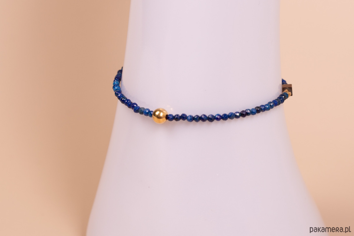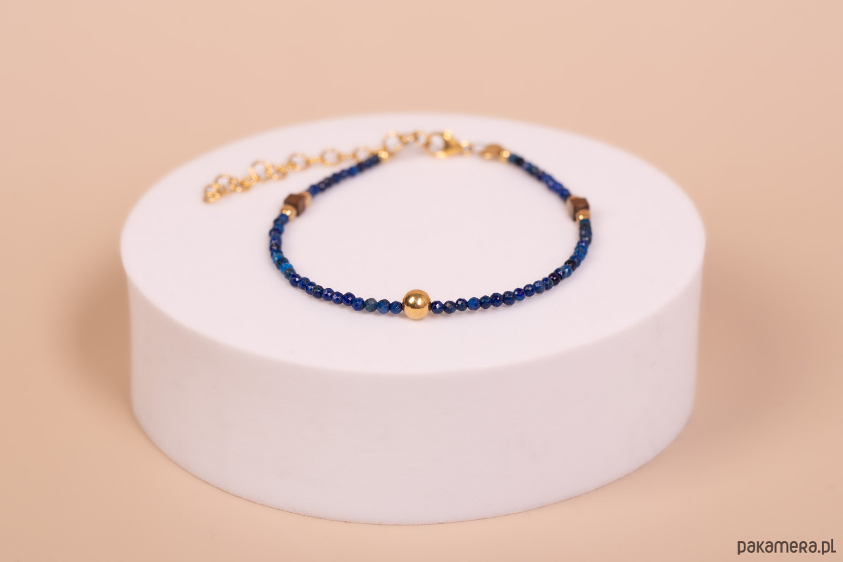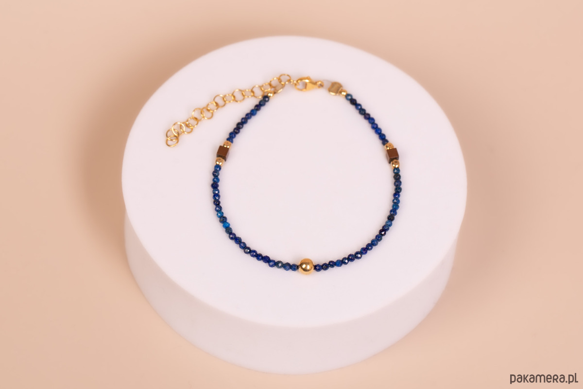 Forma i charakter: Bransoletka wyróżnia się minimalistyczną, a zarazem wyrazistą estetyką. Centralnym punktem projektu jest gładka, pozłacana srebrna kula, która efektownie kontrastuje z migotliwą strukturą fasetowanych kamieni. Ciemne kostki hematytu rozmieszczone po bokach nadają biżuterii nowoczesnego, geometrycznego sznytu. Połączenie królewskiego błękitu ze złotem tworzy ponadczasową całość, która doskonale rozświetla nadgarstek.