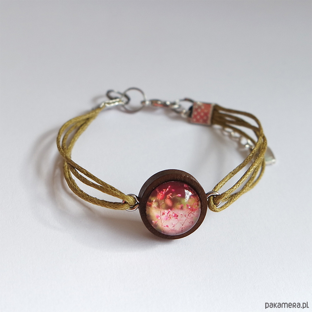 Bransoletka wykonana jest z woskowanych sznureczków. Oprawa wykonana jest z drewna.