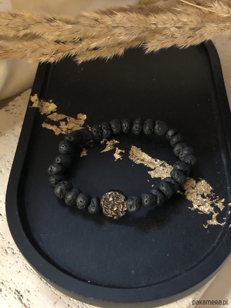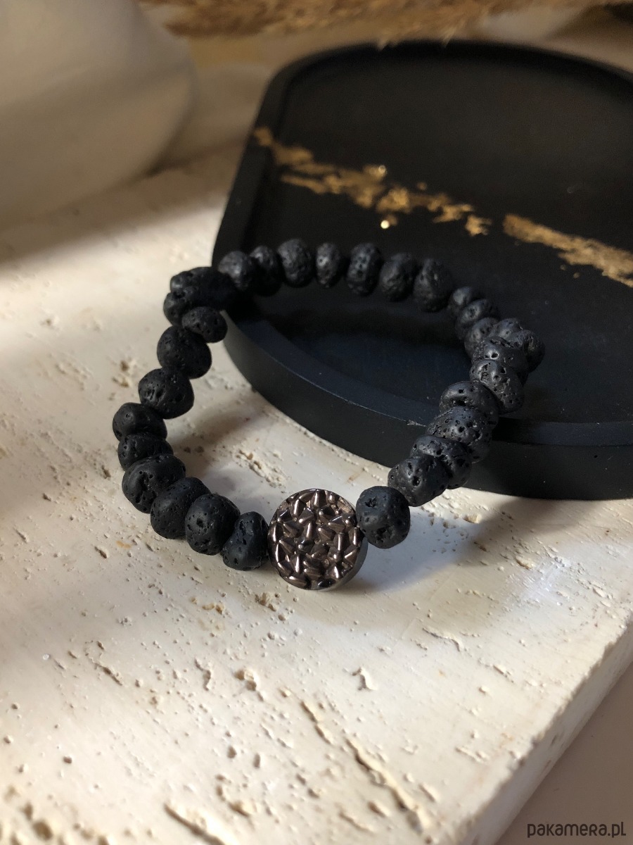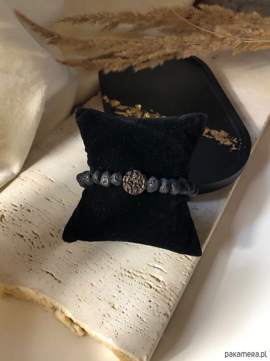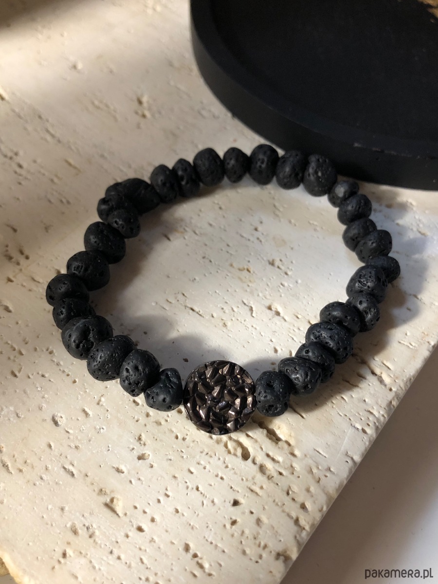 Bransoletka wykonana z naturalnej lawy i kamienia. Na gumkę jubilerską nawleczono nieregularne kulki lawy oraz krążek hematytu platerowanego średnicy 10 mm.