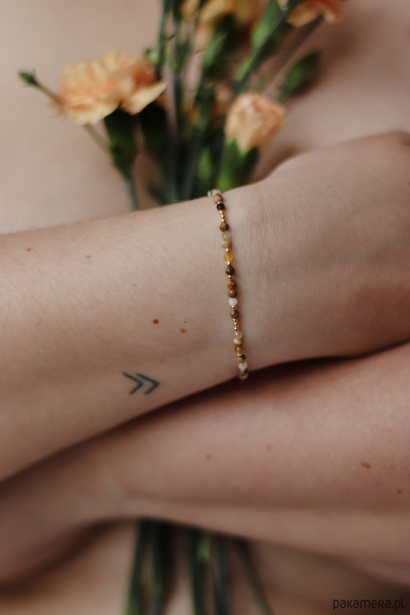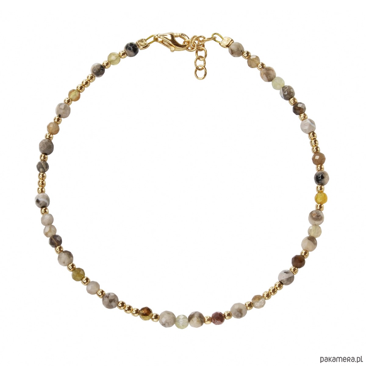 Bransoletka wykonana z kamieni naturalnych o nazwie agat oraz z maleńkich koralików w złotym kolorze.