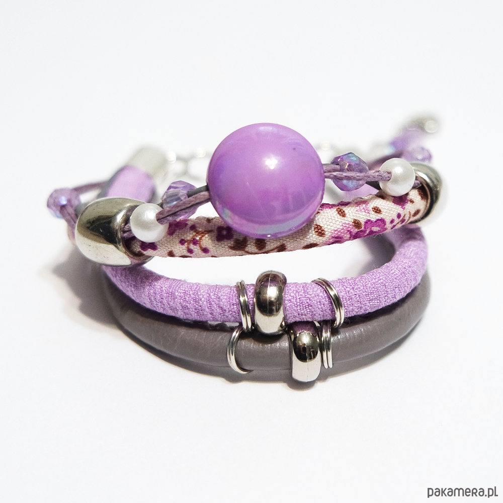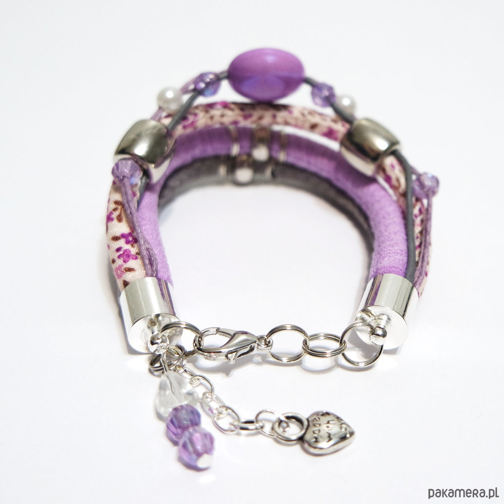 Bransoletka zrobiona jest z rzemieni z eko-skóry, skóry, materiału i sznurka.