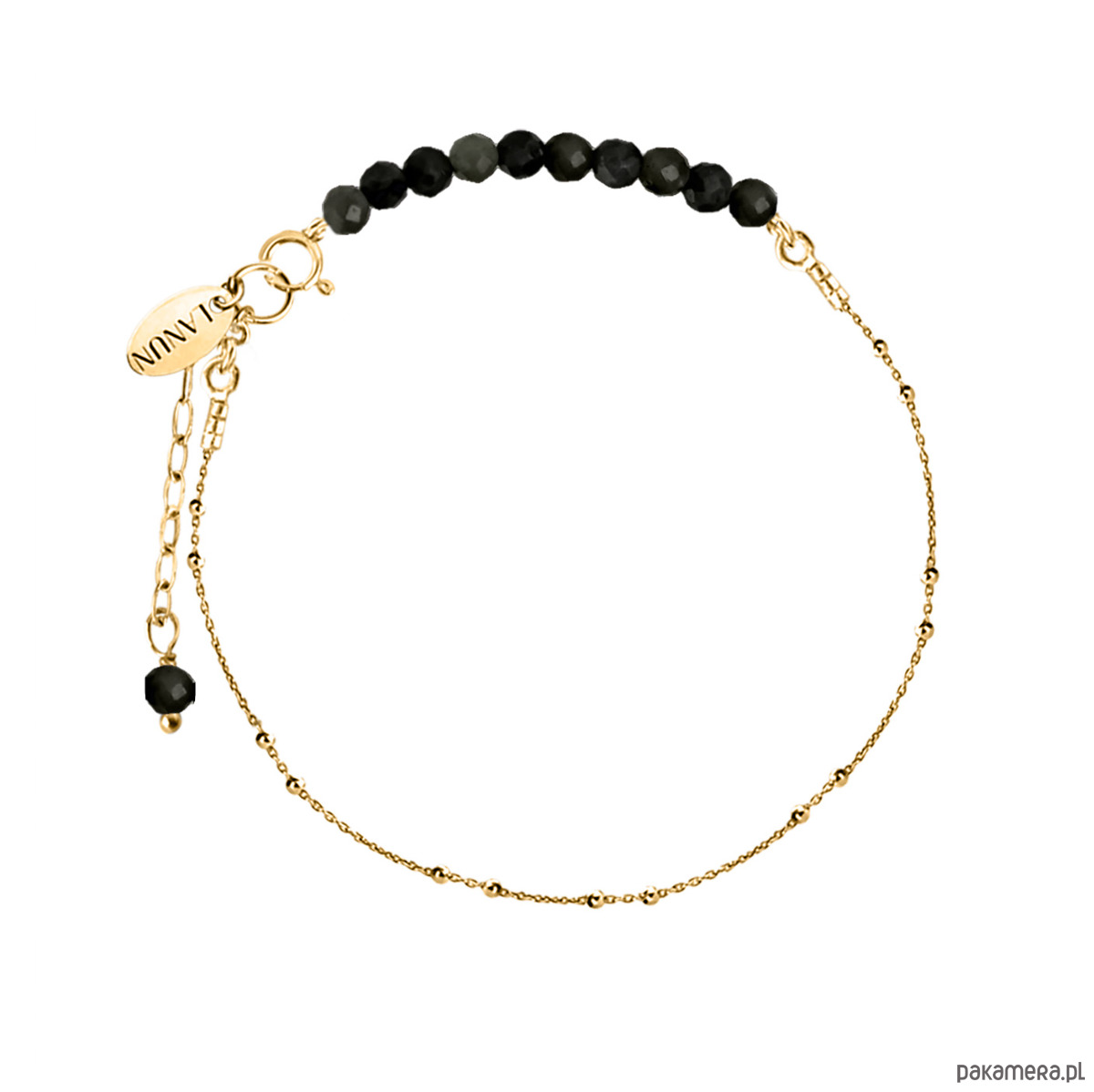 Delikatny łańcuszek o nieregularnie występujących kuleczkach, połączony jest z przywieszką z turmalinami. Kamienie te są wykonane w szlifie fasetowym i mienią się w odcieniach czerni. Kamienie użyte w bransoletce dodają siły, chronią nas przed negatywną energią i nieprzyjemną atmosferą. Osoby, które noszą biżuterię z czarnym turmalinem charakteryzują się większą pewnością siebie. Bransoletka wykonana jest ze srebra próby 925 pozłacana 24K złotem.