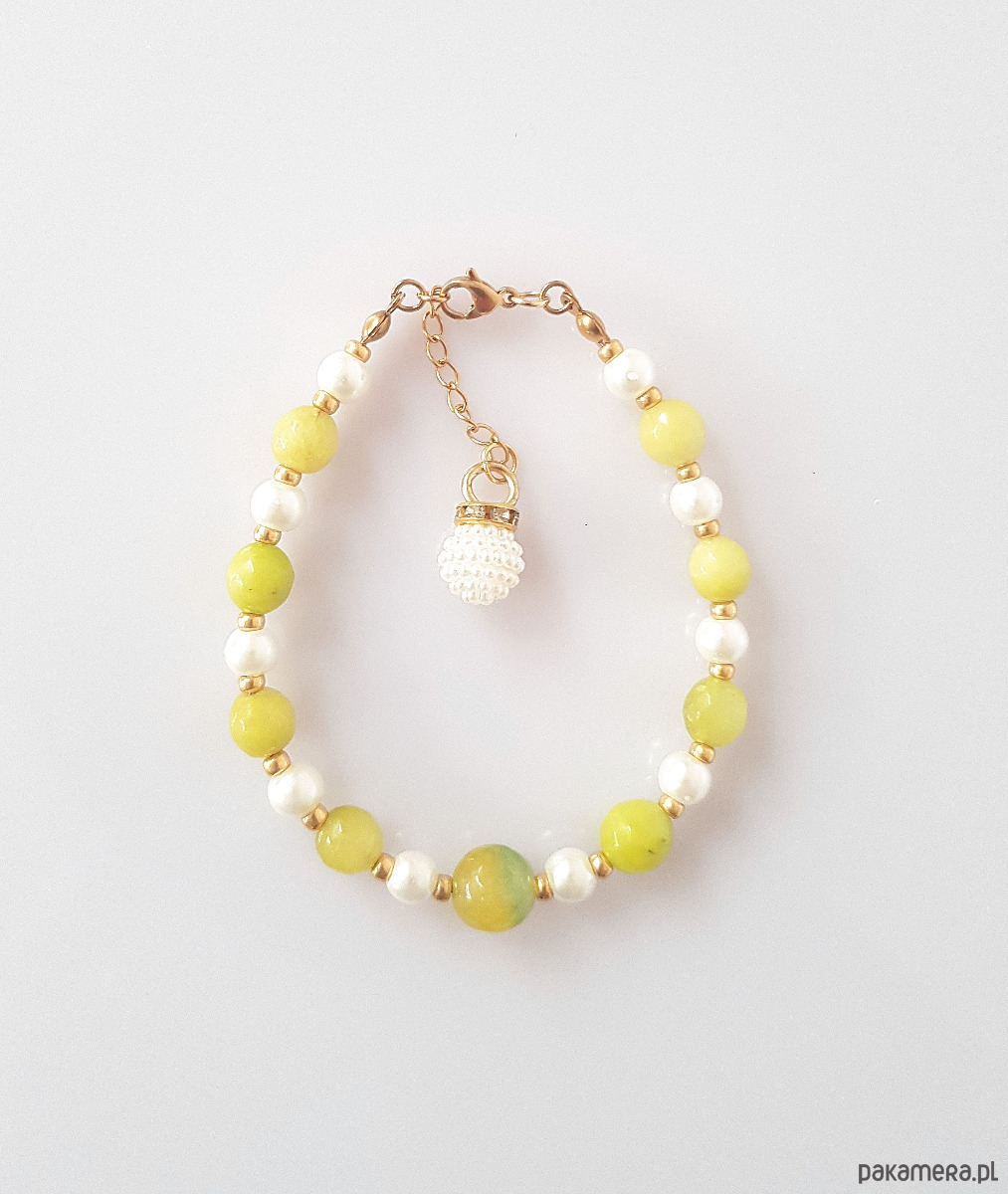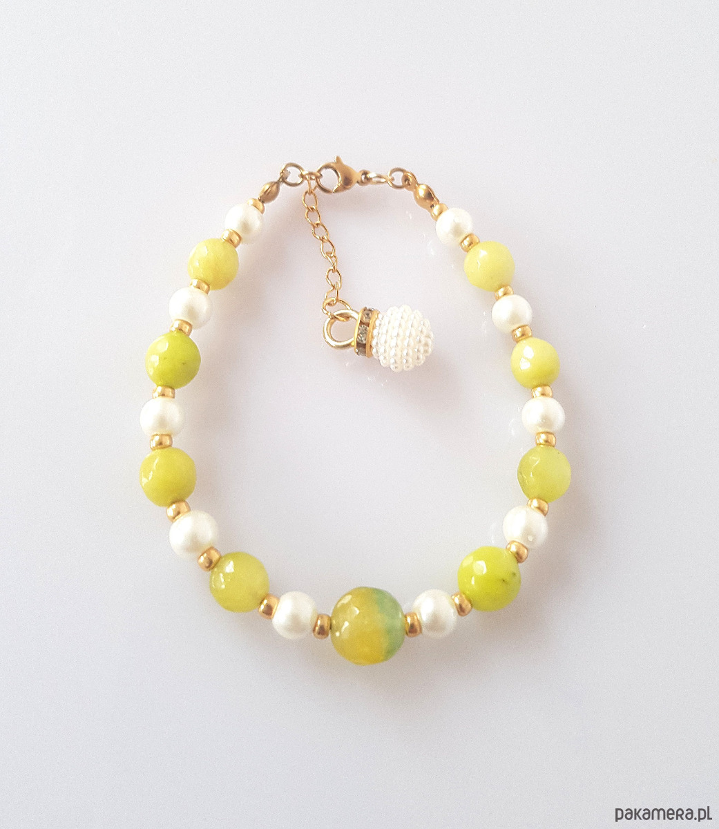 Fasetowane kulki jadeitu w kolorze limonki i białe perełki muszlowe.