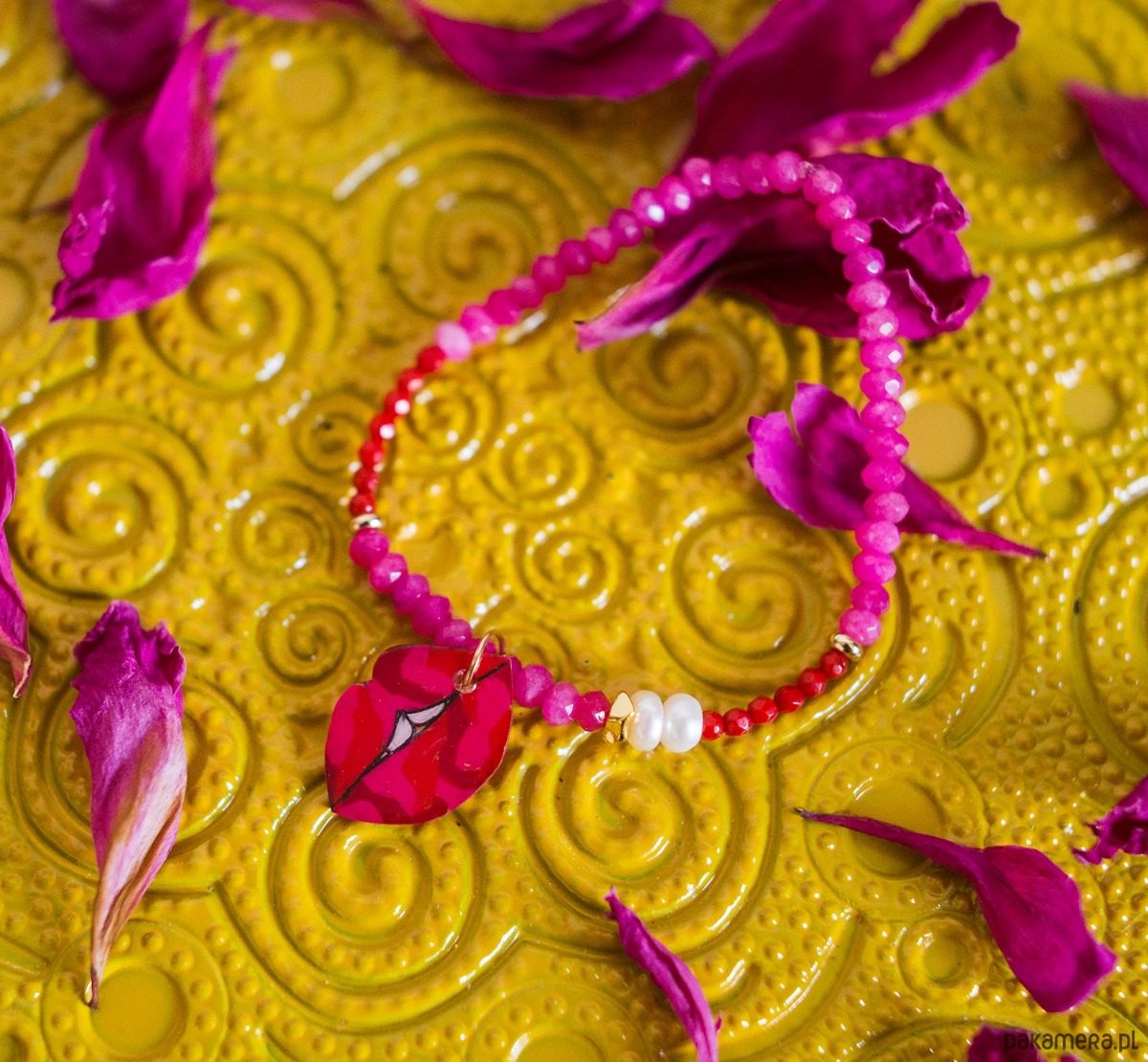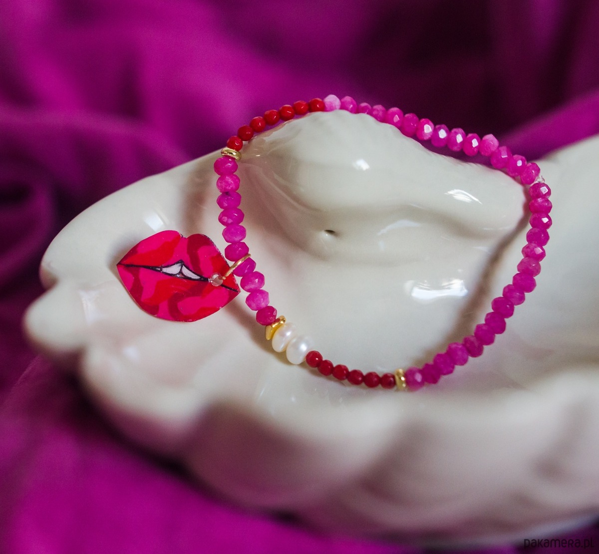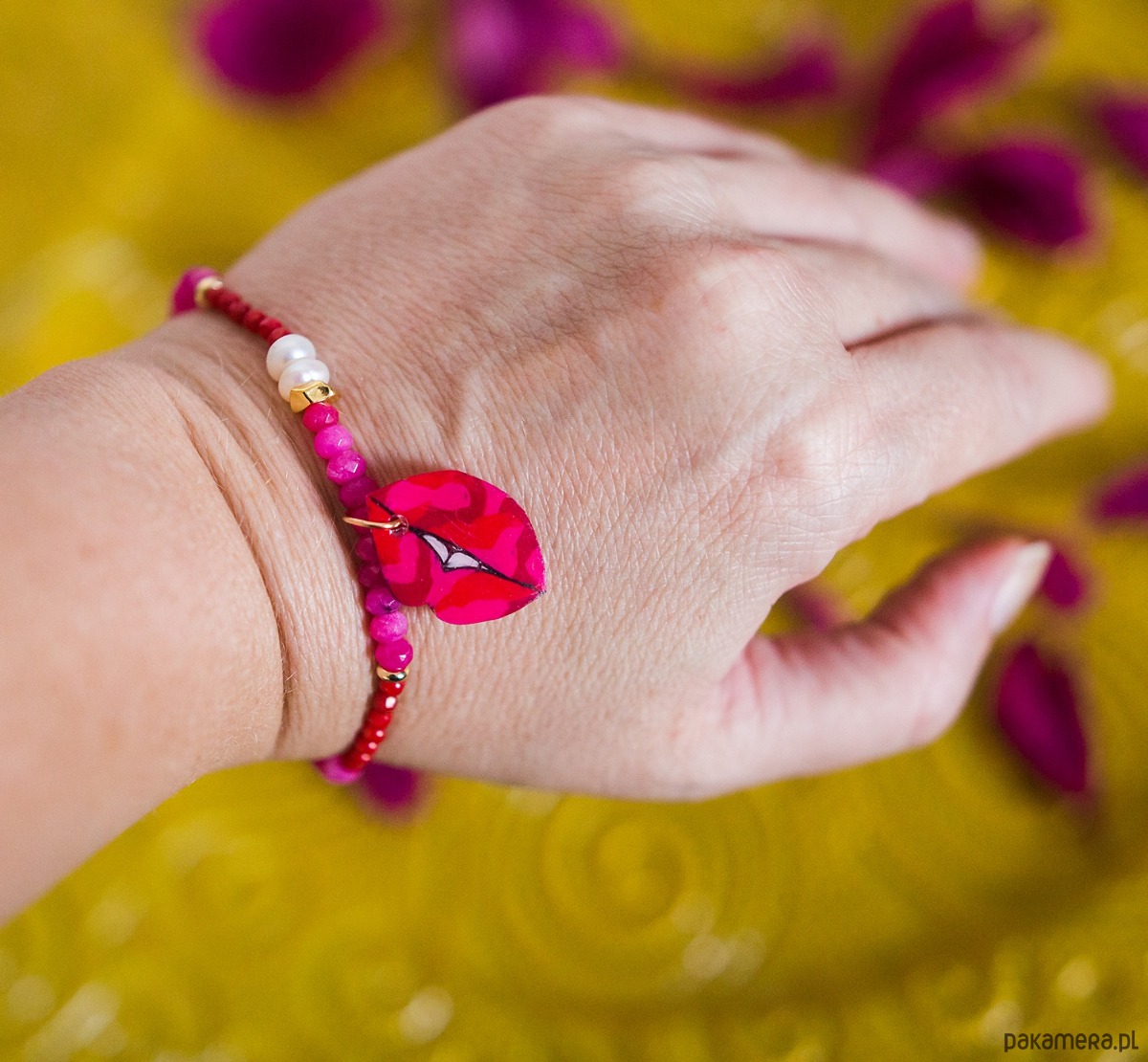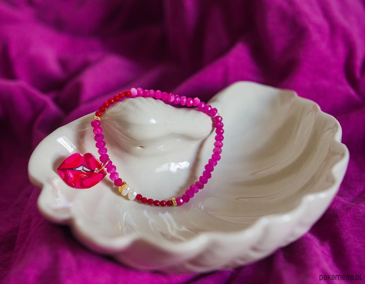 Ta bransoletka to stylowy dodatek, zachwyci Ci intensywnymi kolorami, oraz kobiecą zawieszką w kształcie ust.