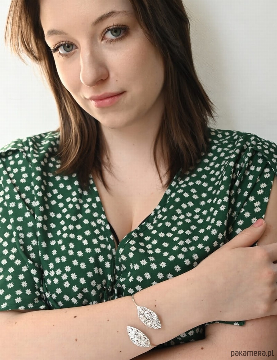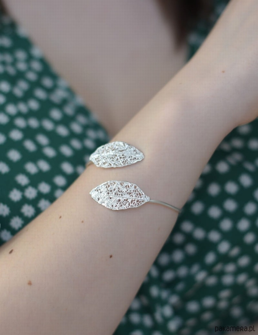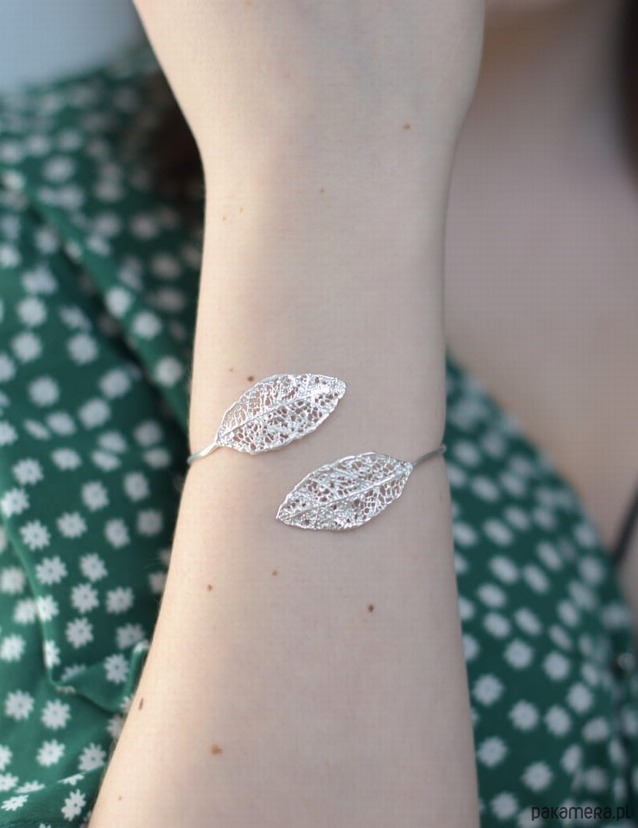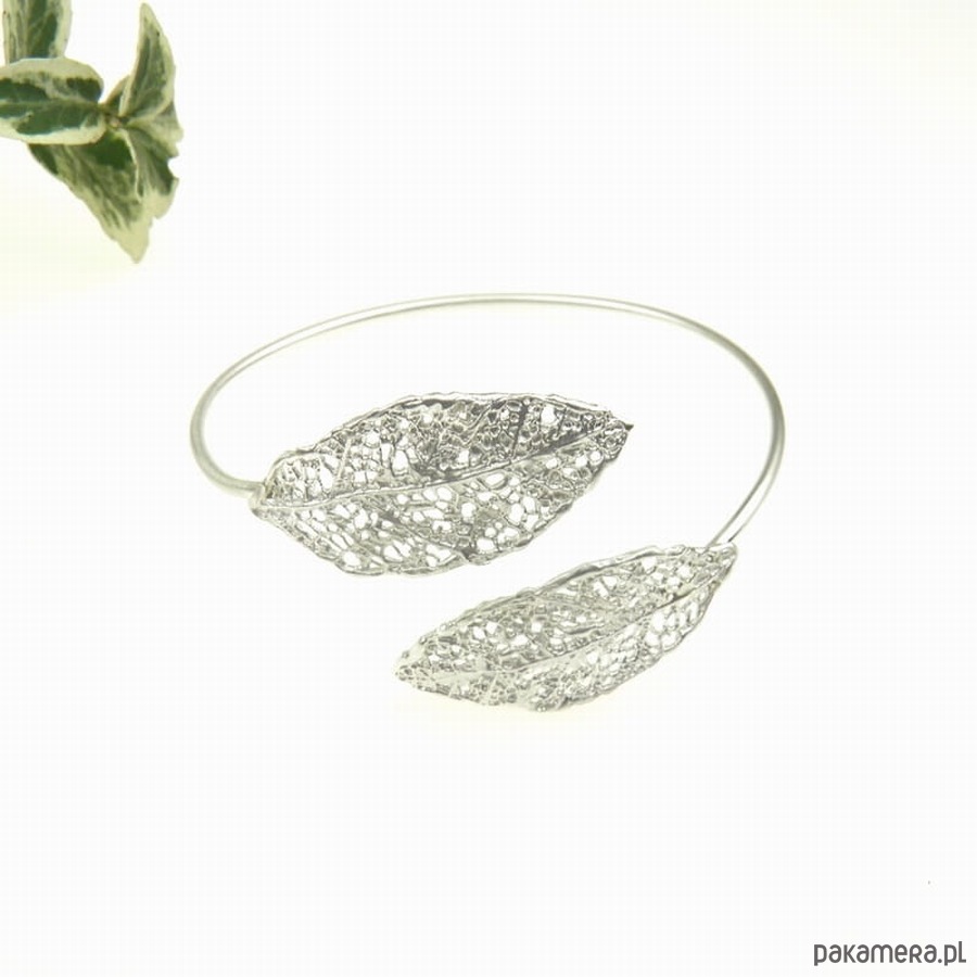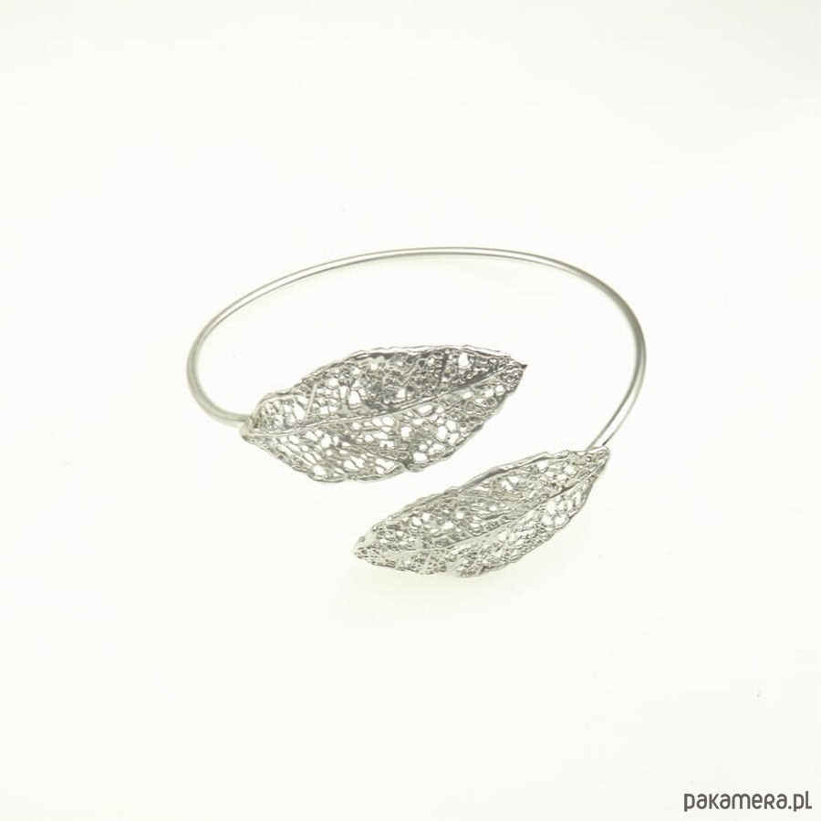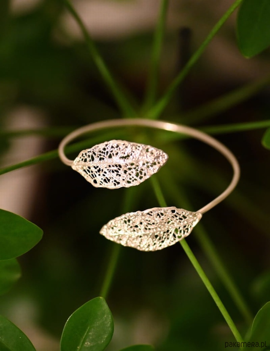 Delikatna, otwarta bransoletka wykonana ze srebra próby 925, zakończona dwoma subtelnymi listkami. Ażurowy wzór liści nadaje jej lekkości i elegancji, inspirowanej naturą. Idealna do codziennych stylizacji oraz jako wyjątkowy dodatek na specjalne okazje.