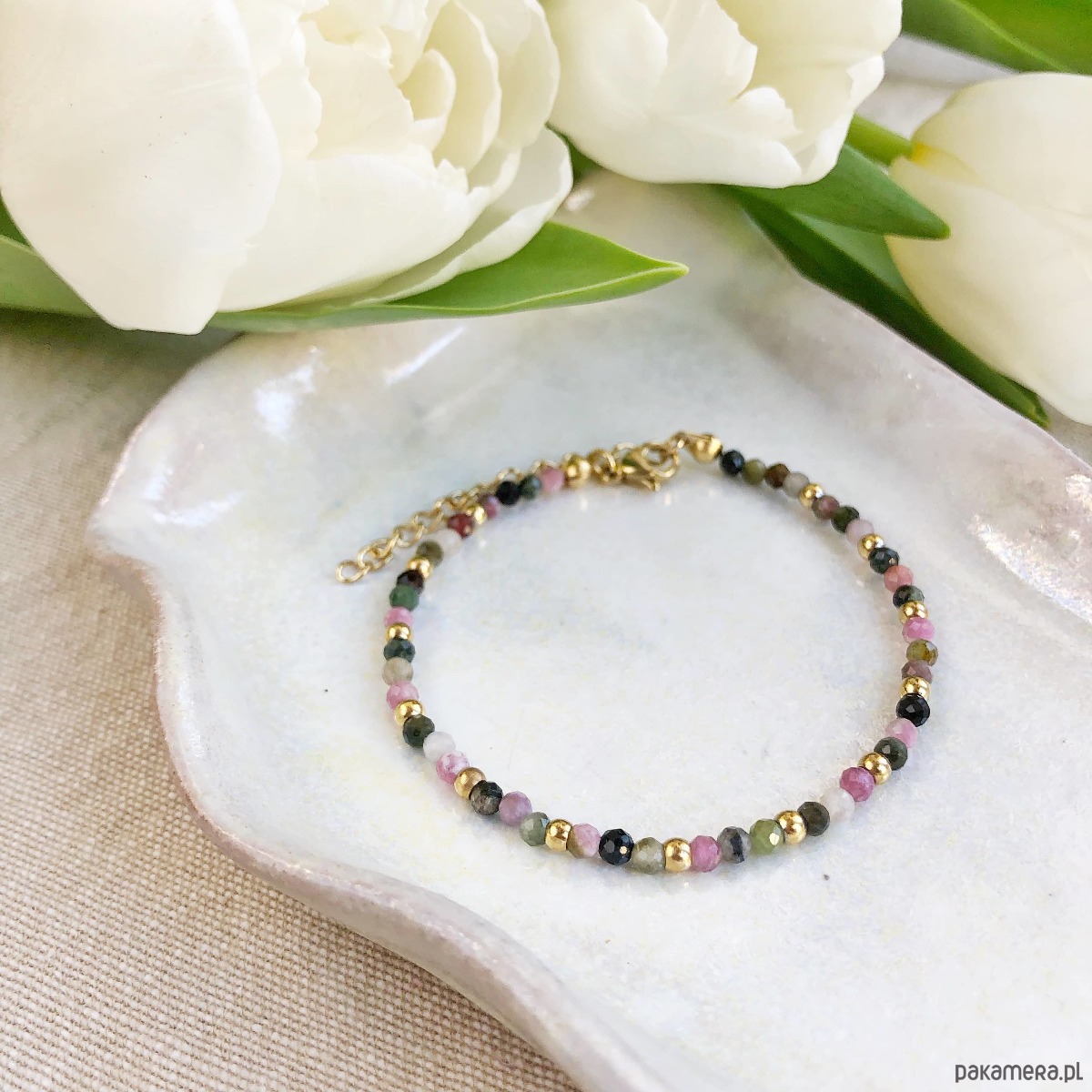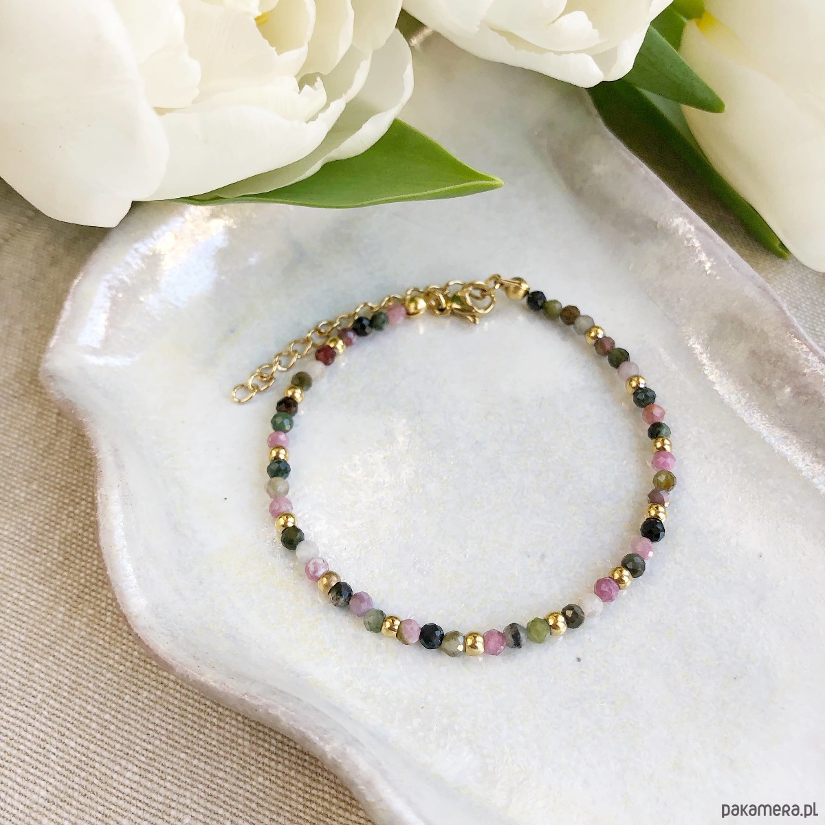 Subtelna bransoletka z pięknie wielokolorowo mieniącymi się kamieniami półszlachetnymi - turmalinem o średnicy 3mm, przeplatanymi złotymi kulkami ze stali chirurgicznej 3mm.